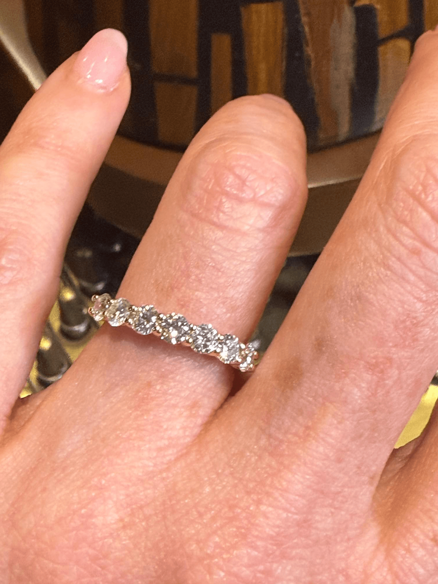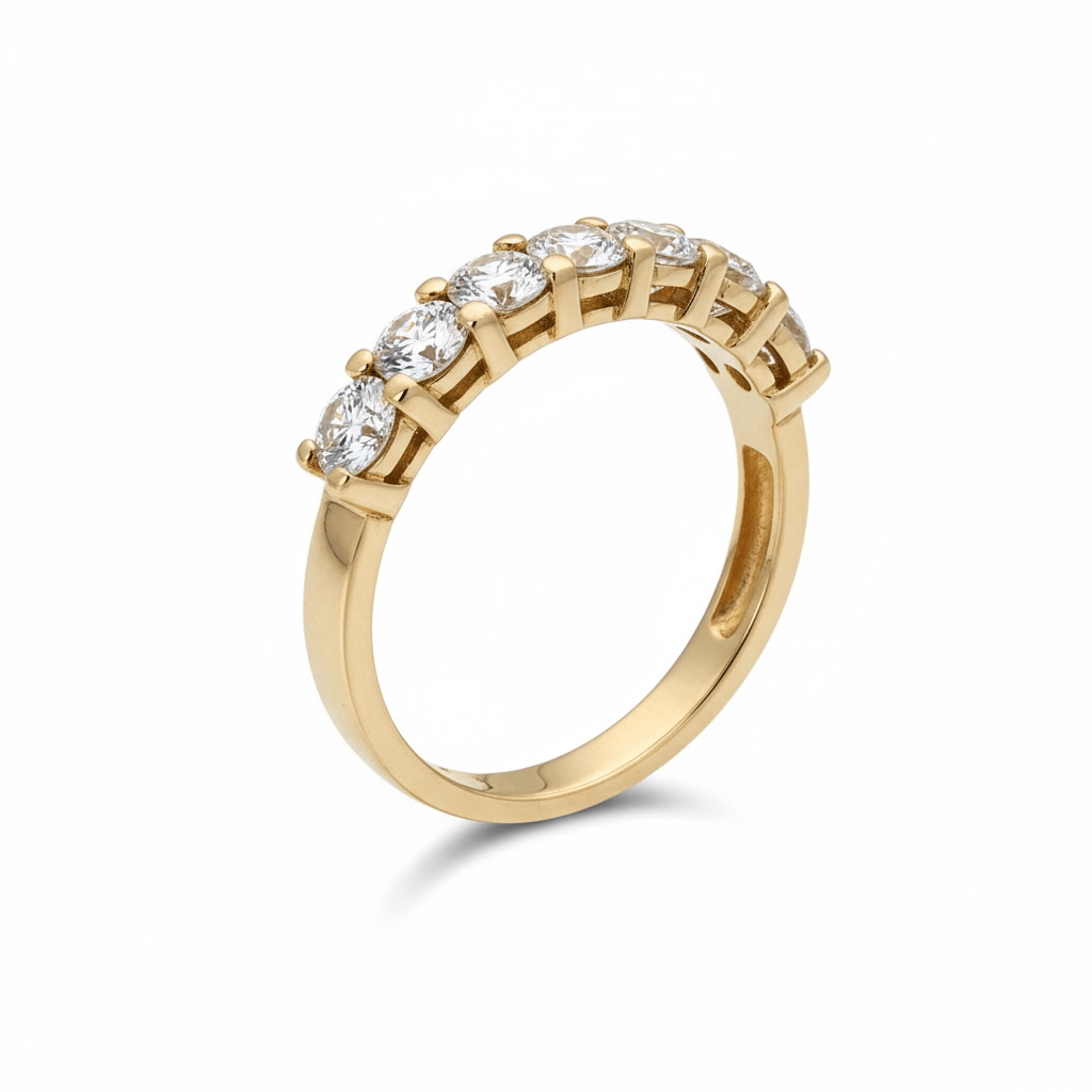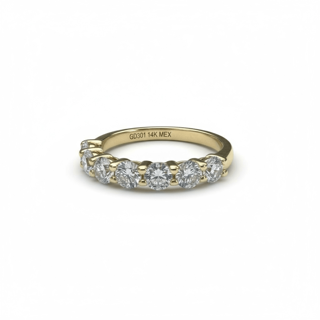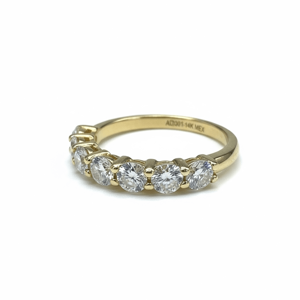 Un anillo tipo half eternity que irradia elegancia y sofisticación. Está elaborado en oro de 14 quilates, adornado con una fila de diamantes corte brillante redondo, cuidadosamente engarzados en garras para maximizar el reflejo de la luz desde cada ángulo. Su diseño clásico y equilibrado lo convierte en una pieza perfecta para acompañar un anillo de compromiso o lucir sola como símbolo de amor y estilo eterno.