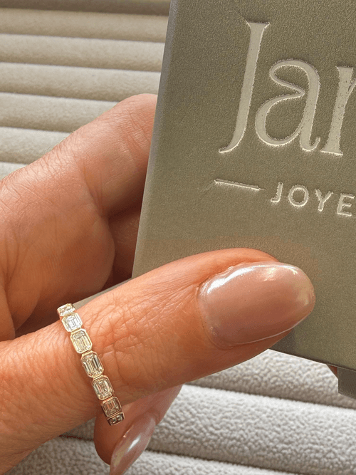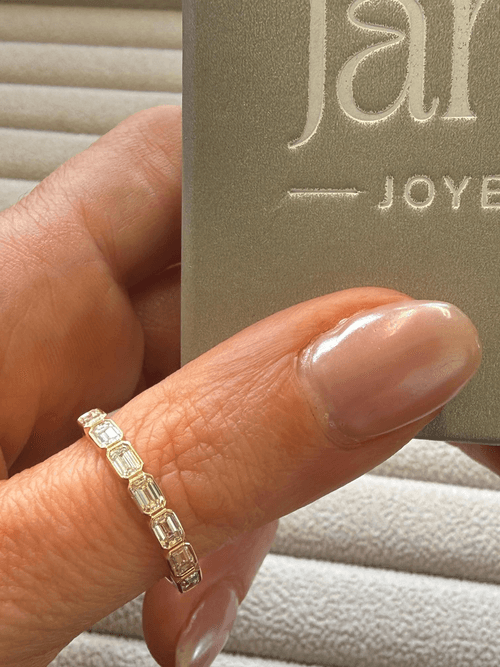 Churumbela de diamantes corte esmeralda elaborada en oro amarillo de 14K, donde cada piedra se alinea en un elegante engaste tipo bisel que enmarca su silueta con precisión. Sus facetas escalonadas reflejan la luz con un brillo sofisticado y profundo, aportando un carácter moderno y atemporal. Una pieza de líneas limpias que celebra la elegancia discreta y el lujo refinado.