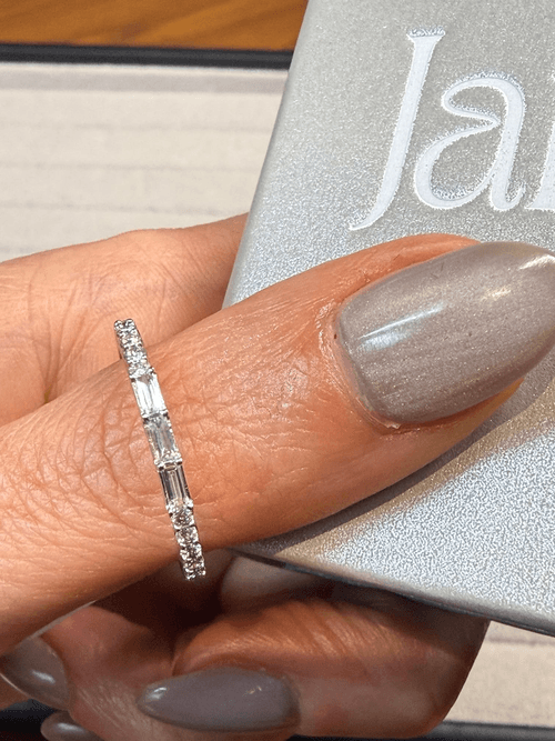 Su diseño estilizado crea un contraste sofisticado entre la pureza lineal de las baguettes y el destello continuo de los brillantes, logrando una pieza luminosa, moderna y atemporal.