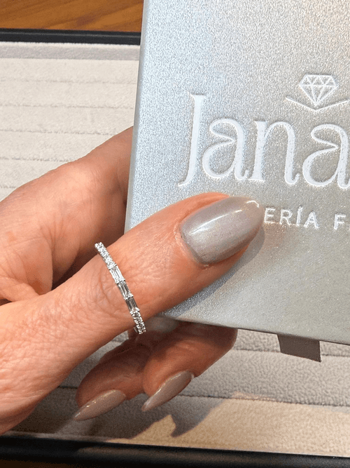 Montada en oro blanco, esta churumbela es ideal para llevar sola por su elegancia minimalista o para combinar en stacking con anillos de compromiso o alianzas, aportando un brillo refinado y equilibrado.