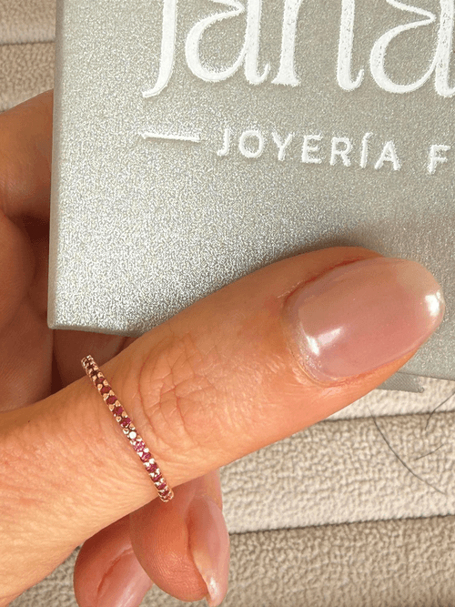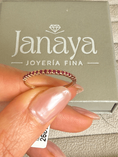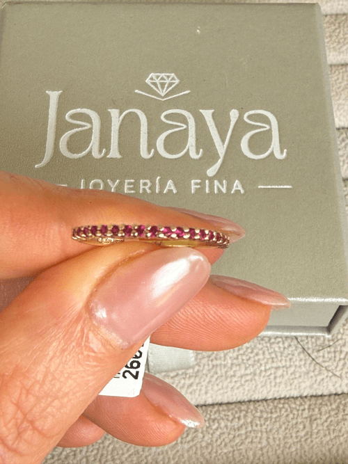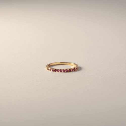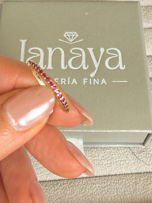 Delicada churumbela en oro amarillo 18K adornada con una fina línea de rubíes naturales en corte brillante, engastados en pavé continuo que envuelve elegantemente la mitad de la pieza. Su diseño delgado y minimalista resalta el intenso color rojo de cada piedra, creando un brillo sutil pero sofisticado, ideal para llevar sola o en layering.