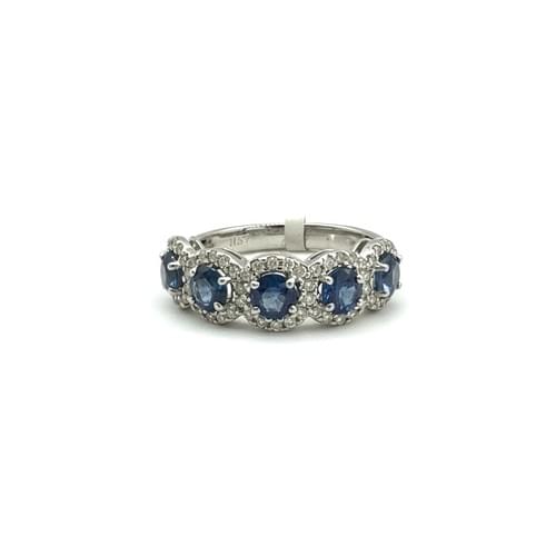 Un anillo de elegancia clásica y presencia intensa. Presenta una hilera de zafiros azules redondos, cada uno enmarcado por un halo de diamantes brillantes que realzan su profundidad y luminosidad. El diseño tipo eternity parcial crea un efecto continuo de brillo, mientras que el montaje en oro blanco aporta un acabado moderno y sofisticado.