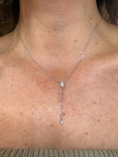 El diseño presenta un delicado motivo central ovalado con diamantes en micro pavé corte brillante redondo, del cual desciende una fina cadena que termina en un diamante solitario en caída. Su diseño estiliza el cuello y aporta un brillo sutil y elegante.