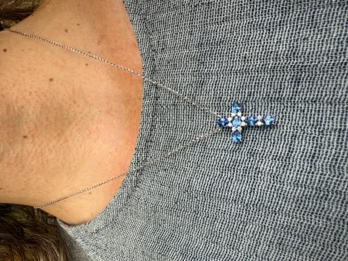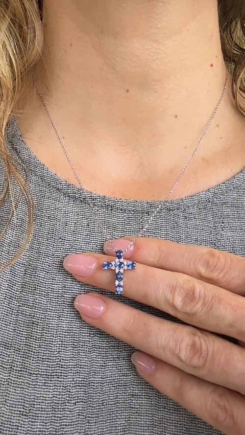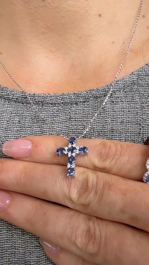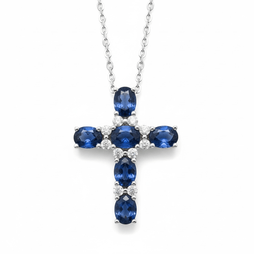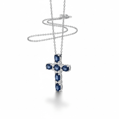 Una cruz de zafiros azules naturales en corte oval, realzada por diamantes en corte brillante que acentúan cada unión con destellos de luz. Su diseño equilibra armonía y profundidad, creando una pieza de alta joyería que simboliza protección, elegancia y luz. Ideal para uso diario o como un amuleto de lujo atemporal.
