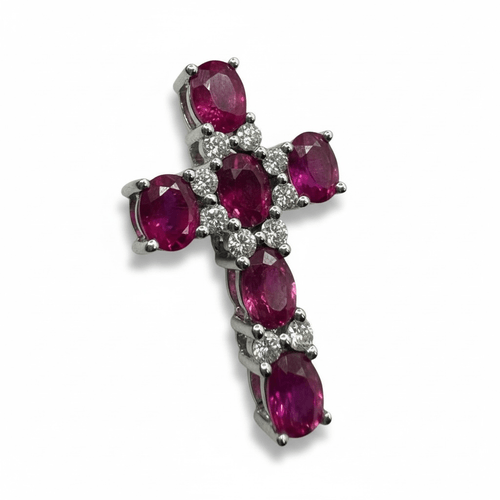 Elaborada en oro blanco con un engaste meticuloso, esta cruz destaca por su equilibrio visual y su brillo excepcional: un símbolo clásico reinterpretado con lujo contemporáneo.