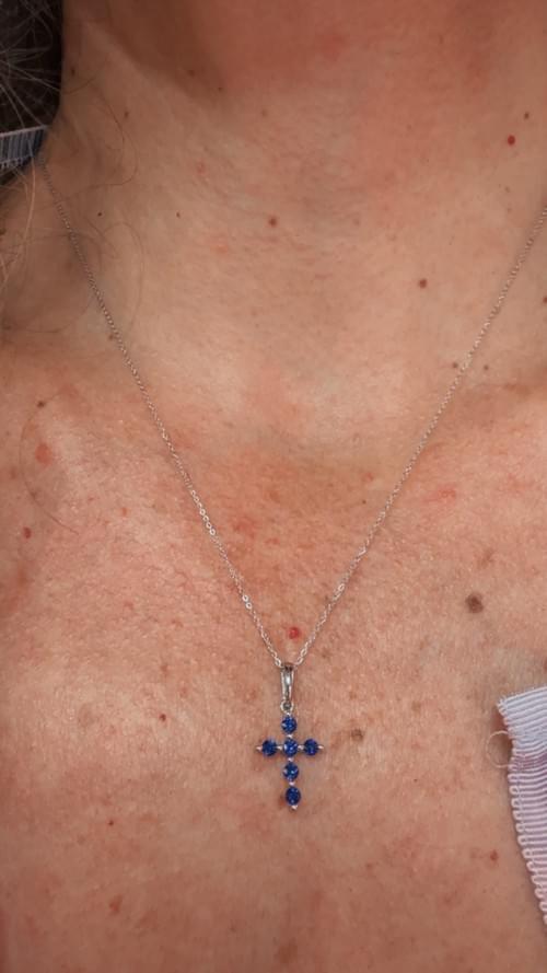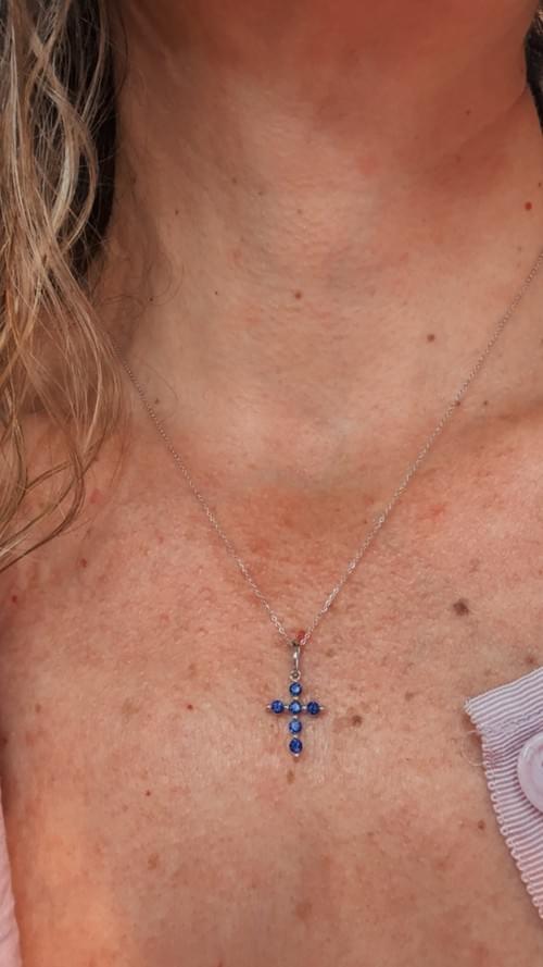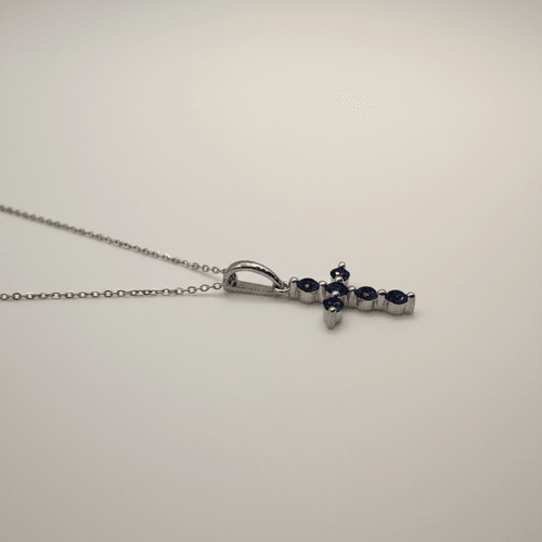 Delicada cruz elaborada en oro blanco, engastada con zafiros naturales corte redondo brillante que destacan por su intenso tono azul profundo.