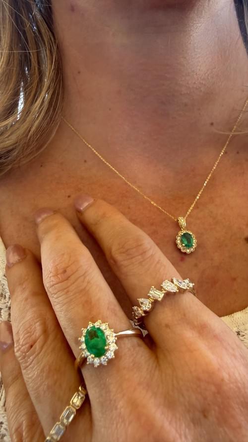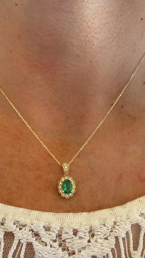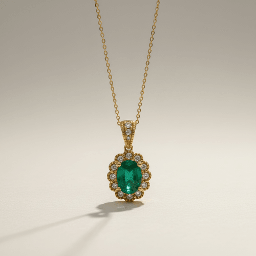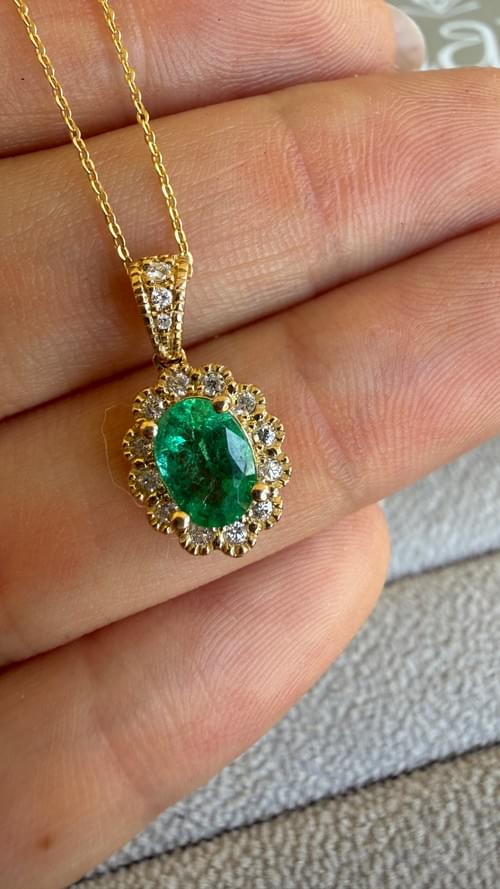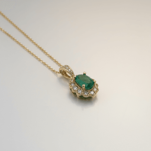 Una joya que captura la esencia del lujo atemporal. Este dije en oro amarillo enmarca una esmeralda natural de intenso color en corte oval, rodeada por un halo de diamantes en delicado engaste tipo buttercup que aporta un sutil efecto floral y una luminosidad excepcional. Su bail con diamantes eleva la pieza, convirtiéndola en un ícono de elegancia y distinción.