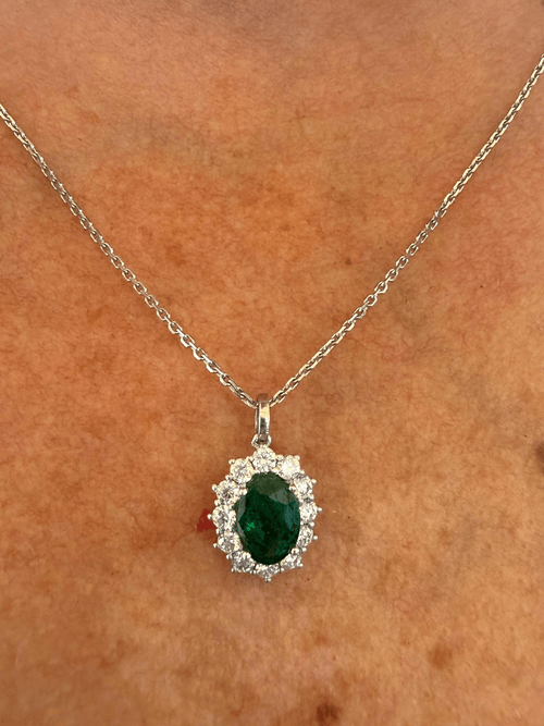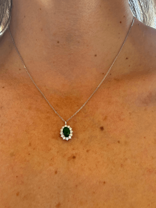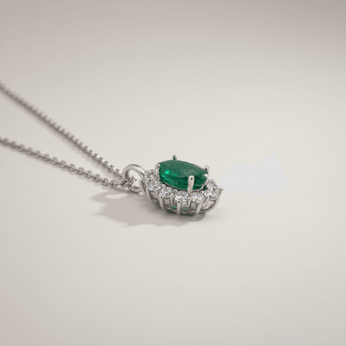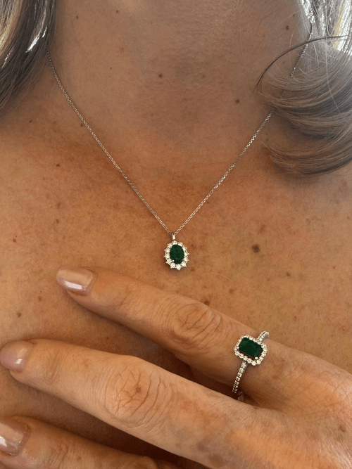 Dije en oro blanco con esmeralda natural de intenso verde en corte oval, enmarcada por un halo de diamantes que realzan su brillo y elegancia. Una pieza clásica y sofisticada que aporta luz y distinción a cualquier look.