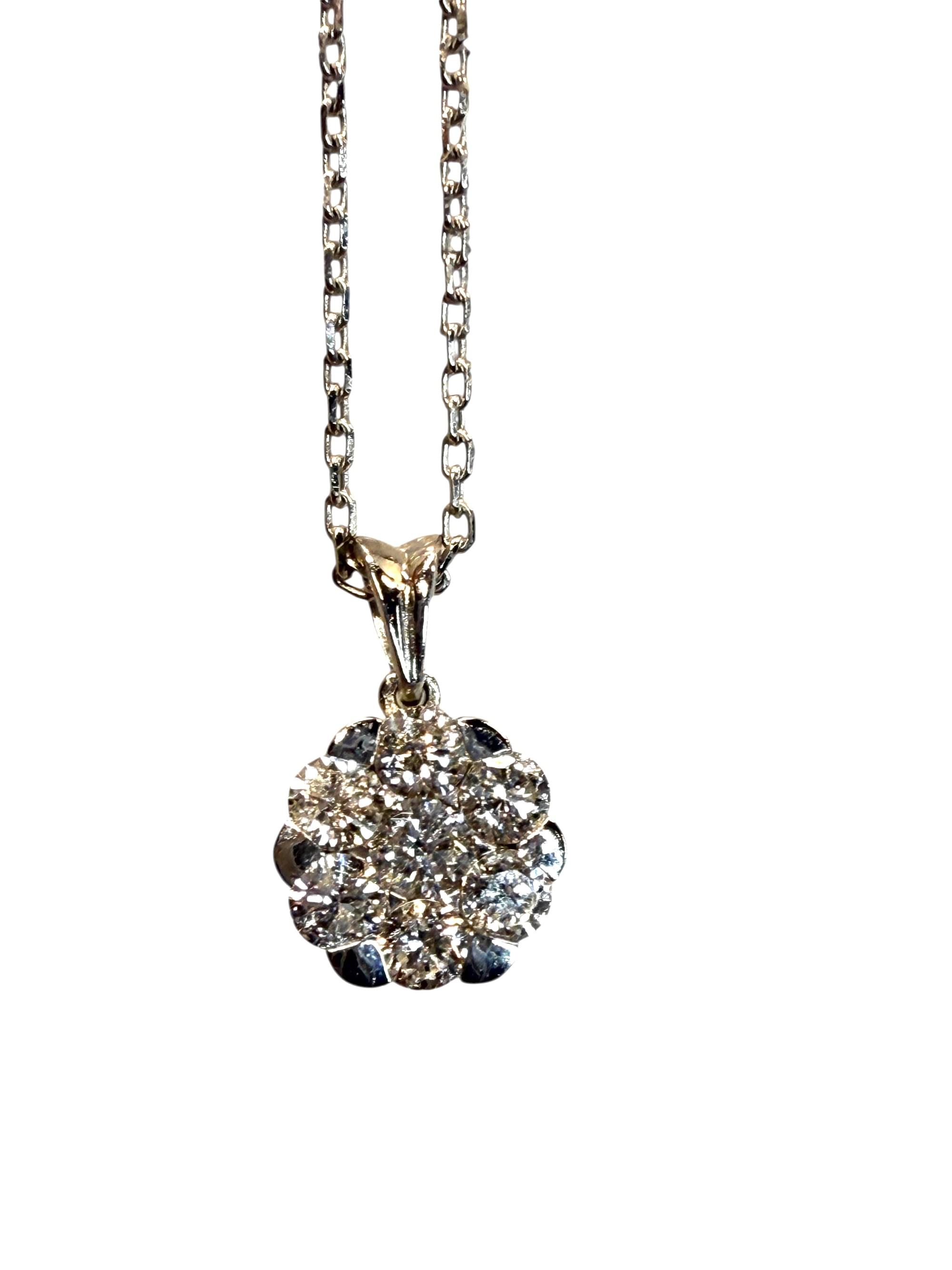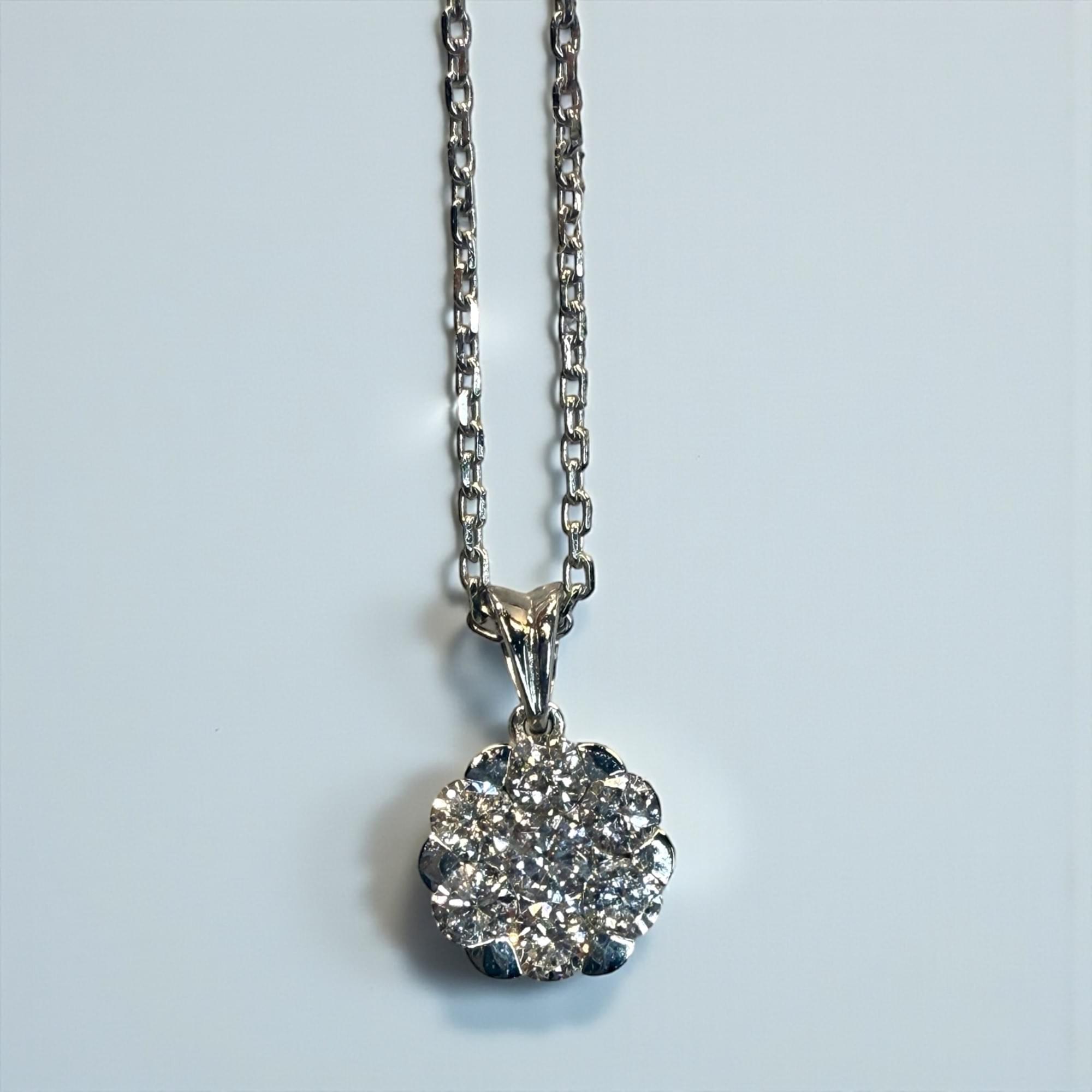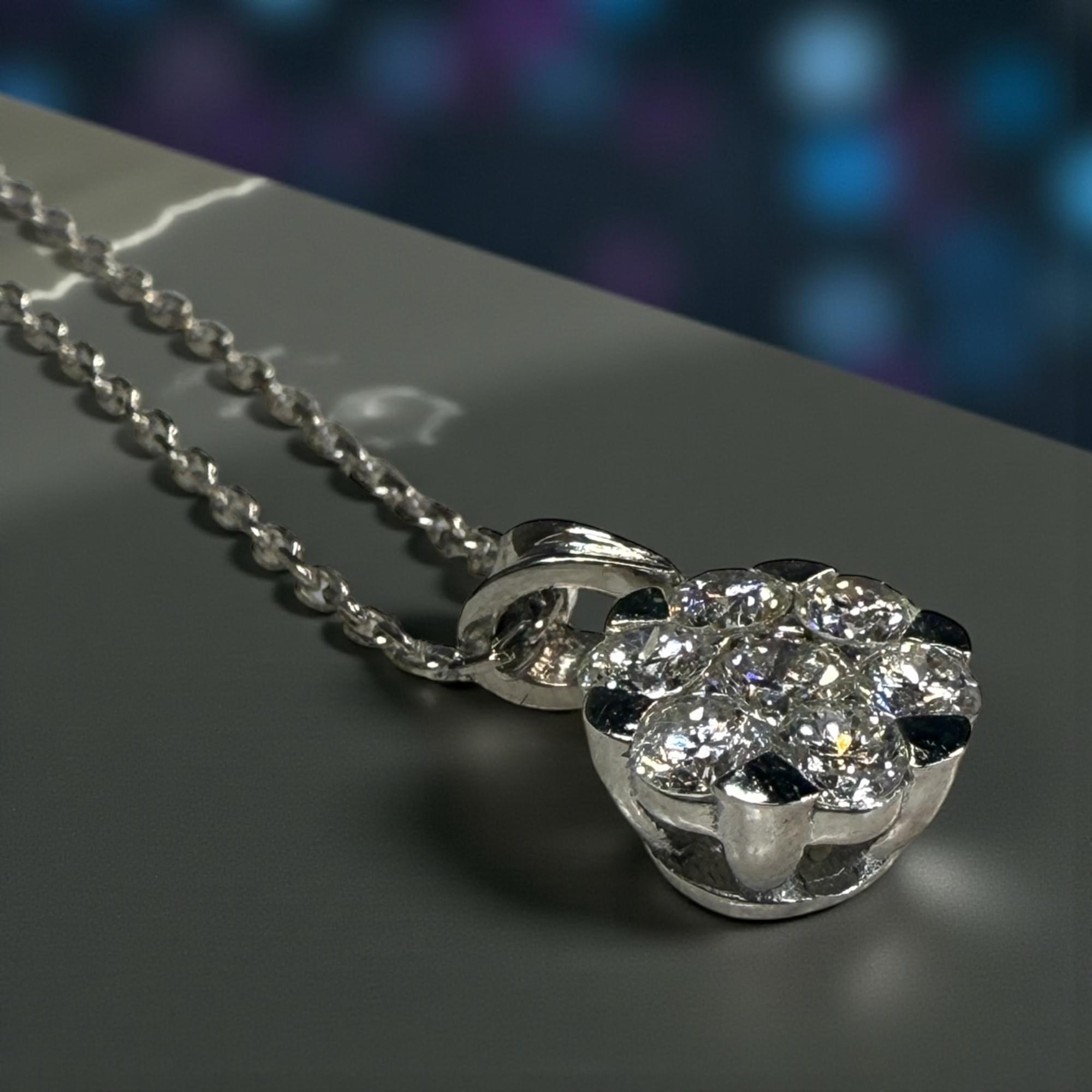 Un dije en forma de flor brillante, elaborado en oro blanco de 14K y engastado con diamantes corte brillante redondo que irradian una luminosidad excepcional. Cada piedra se acomoda en un diseño tipo cluster (racimo) que forma una perfecta flor de destellos, simbolizando elegancia, pureza y sofisticación.