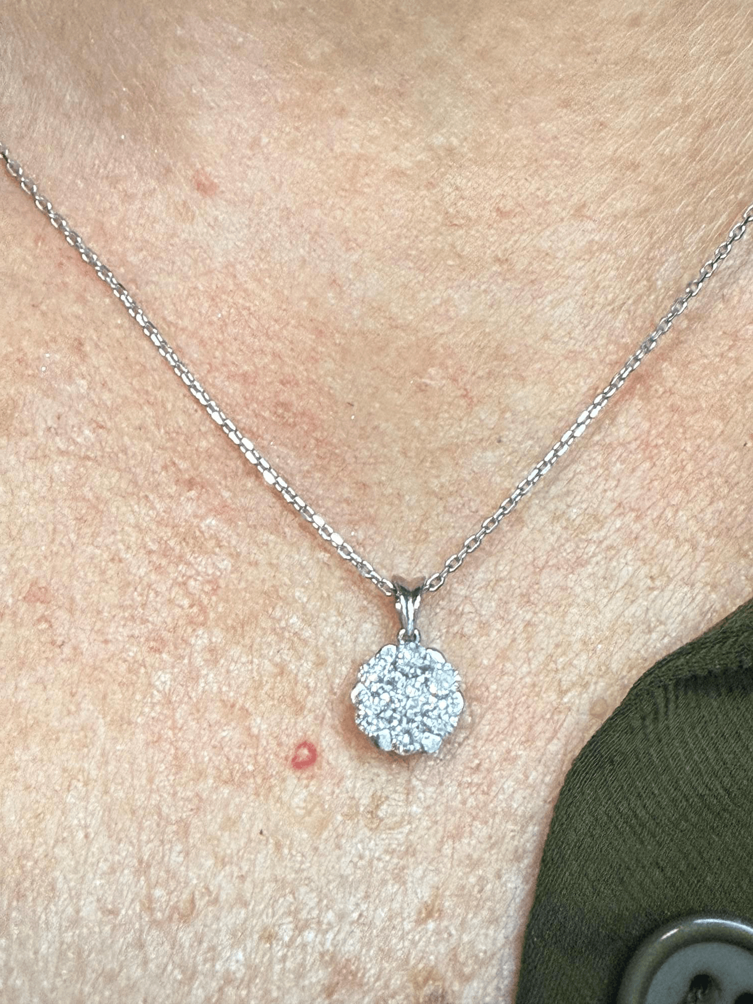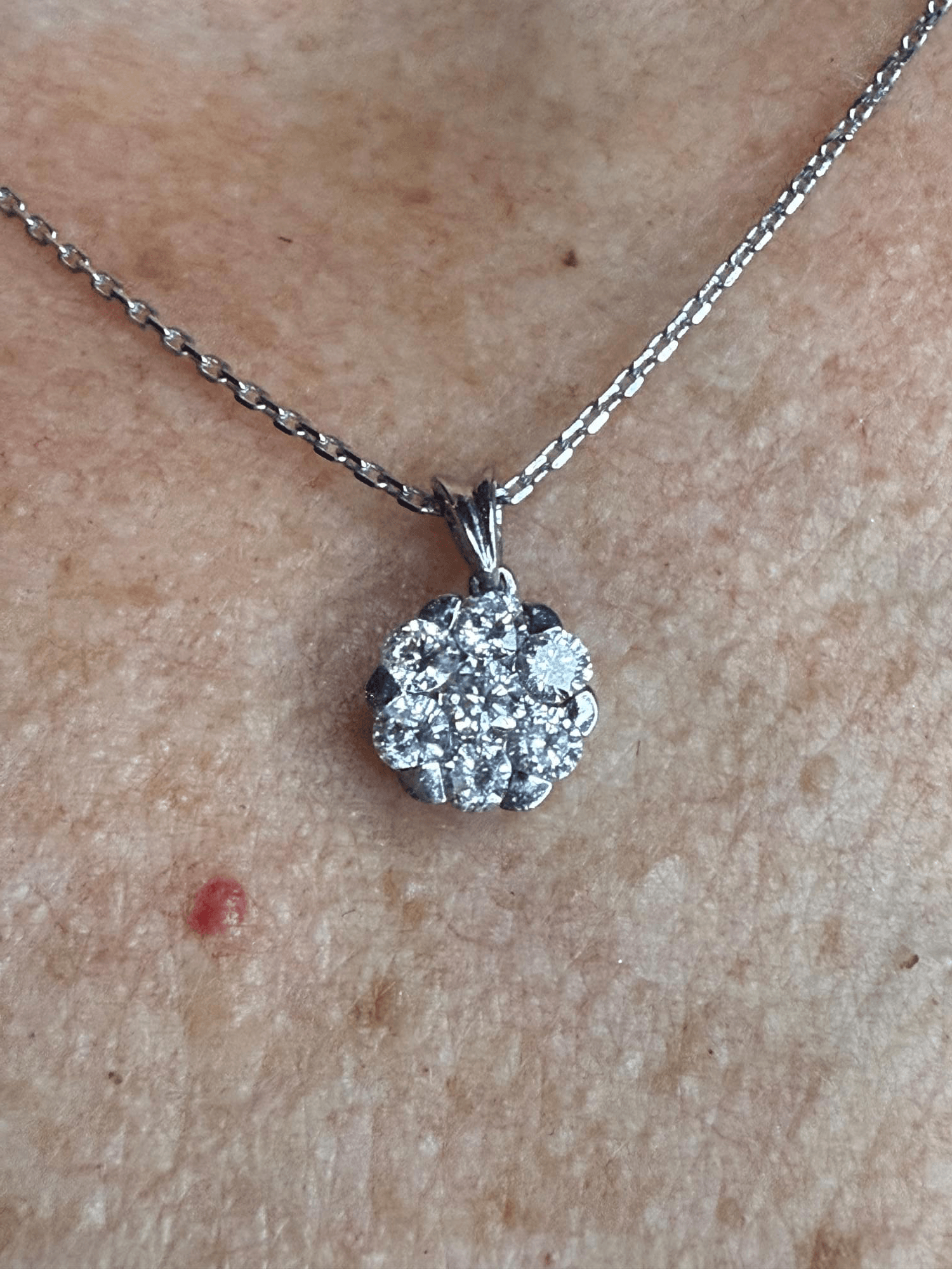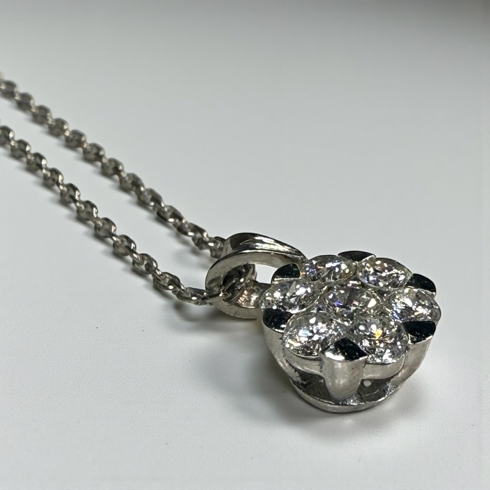 Un dije en forma de flor brillante, elaborado en oro blanco de 14K y engastado con diamantes corte brillante redondo que irradian una luminosidad excepcional. Cada piedra se acomoda en un diseño tipo cluster (racimo) que forma una perfecta flor de destellos, simbolizando elegancia, pureza y sofisticación.