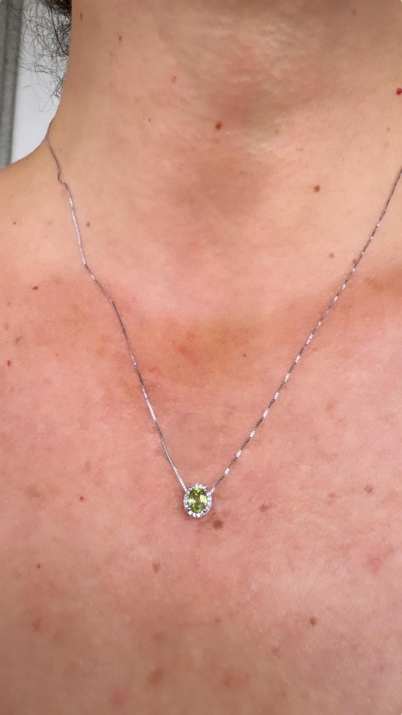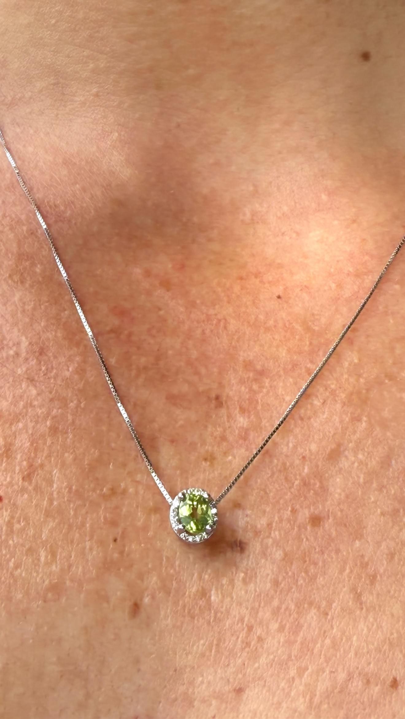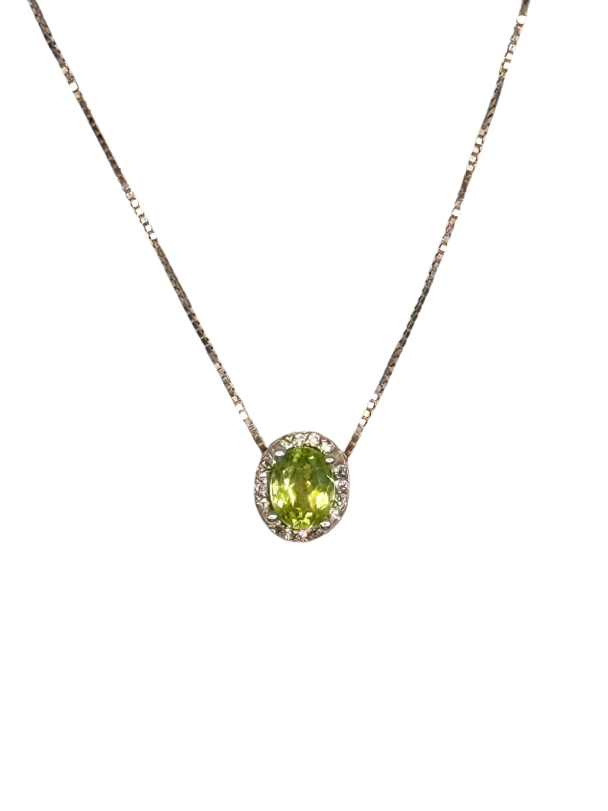 Elegante dije en oro blanco de 14K, con un peridoto central de vibrante tono verde oliva en corte oval, rodeado de un delicado halo de diamantes brillantes que realzan luminosidad. Montado en una fina cadena tipo caja que aporta un toque moderno y sofisticado