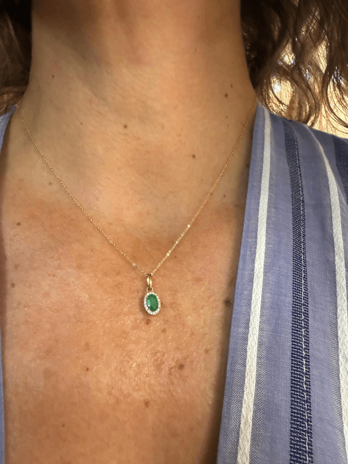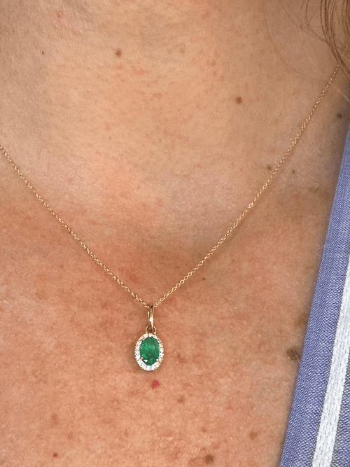 Un diseño clásico que nunca pasa de moda. Este delicado dije presenta una esmeralda natural corte oval como protagonista, rodeada por un halo de diamantes corte brillante que intensifican su color verde profundo y aportan un resplandor sofisticado.