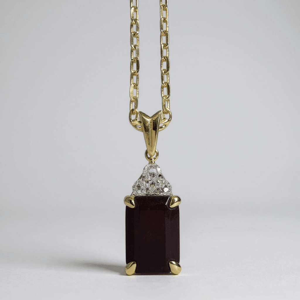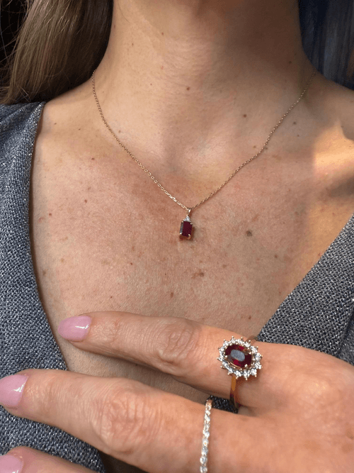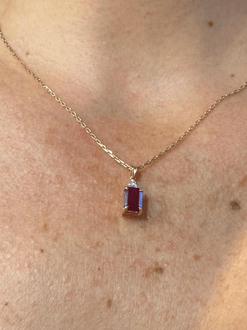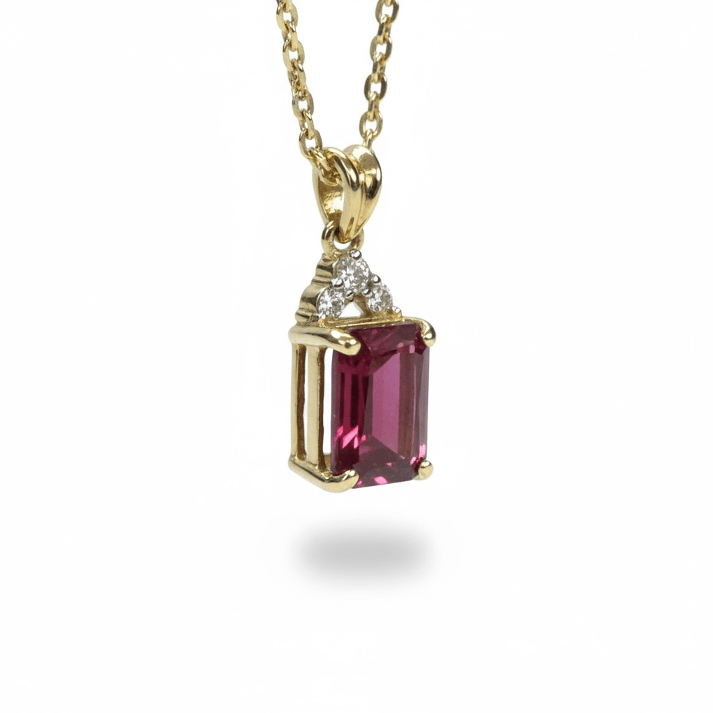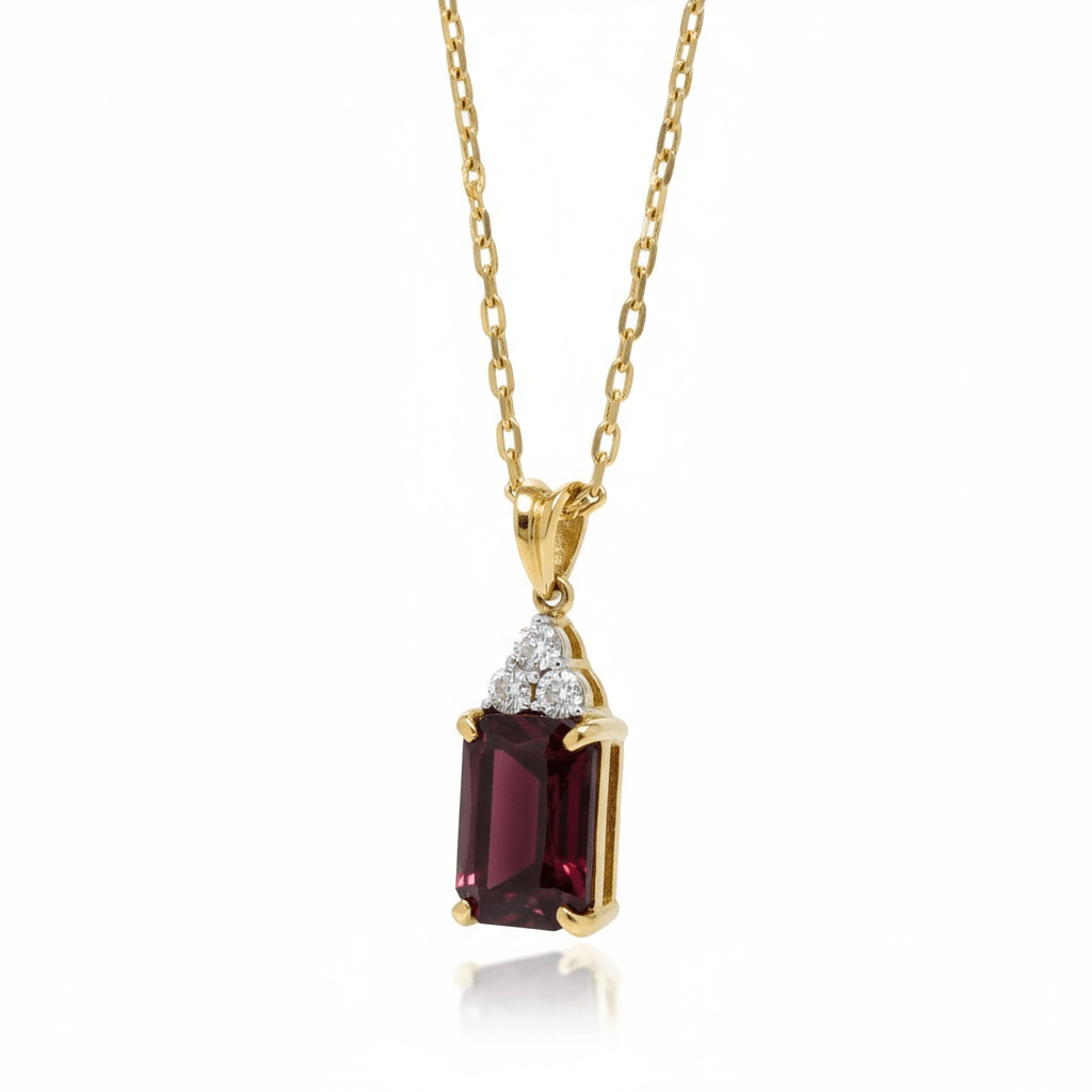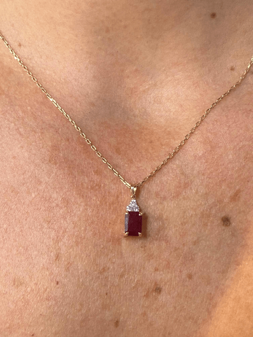Elegante dije de oro amarillo de 14 k con un imponente rubí de tono vino profundo en corte esmeralda, engastado en cuatro garras que realzan su brillo natural. La gema está coronada por un delicado trío de diamantes redondos en pavé, formando una silueta triangular que añade luz y contraste a la composición.