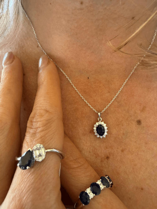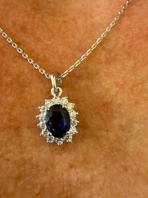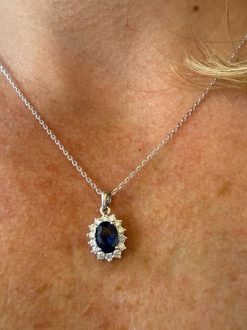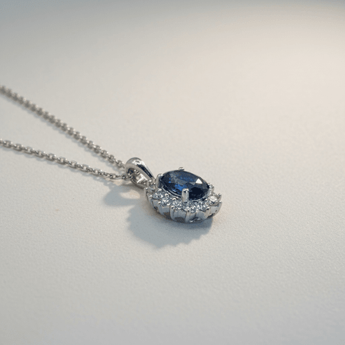 Elegante dije en oro blanco con un zafiro azul profundo en corte oval, rodeado por un delicado halo de diamantes que realzan su intensidad y brillo. Un diseño clásico y atemporal que aporta sofisticación y un toque de lujo en cada detalle. Perfecto para uso diario o para ocasiones especiales.