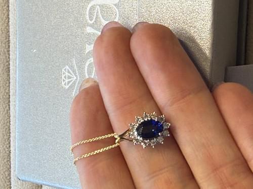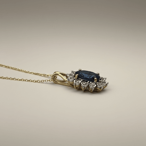 Un zafiro azul profundo en corte oval es el protagonista de este diseño atemporal, rodeado por un halo radial de diamantes naturales corte brillante que crean un efecto de corona luminosa.