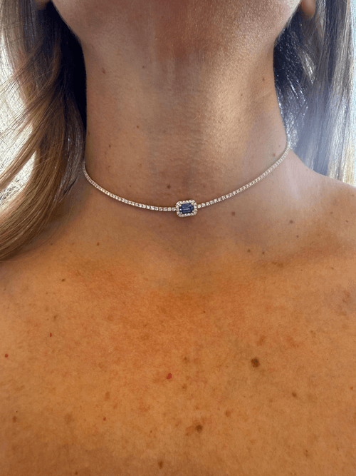 Elegancia atemporal en su máxima expresión. Gargantilla tipo choker en oro amarillo con delicada línea de diamantes que enmarca un zafiro azul profundo en corte esmeralda, rodeado por un halo de brillo intenso. Su diseño fino y sofisticado realza el cuello con un toque de lujo discreto, perfecto para elevar cualquier look, de día o de noche.