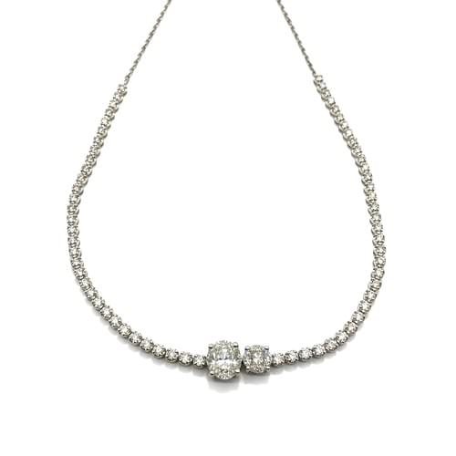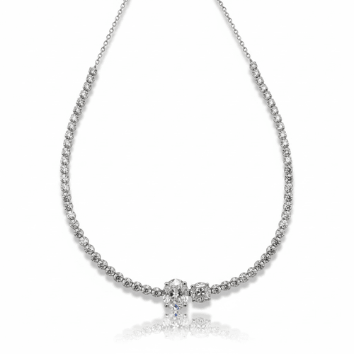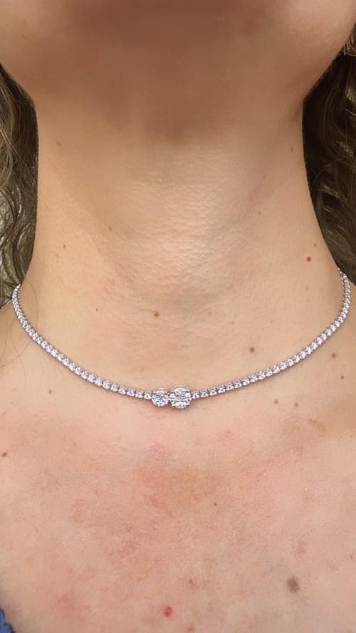 Gargantilla tipo tennis en oro blanco de 18K, con una línea continua de diamantes de corte brillante. Al centro presenta un elegante diseño Duo Cushion, compuesto por dos diamantes en forma cushion estilo cluster, formados por pequeños diamantes de corte brillante que crean un efecto de mayor tamaño y luminosidad. Cada centro está montado en engaste de cuatro garras, logrando una pieza sofisticada, equilibrada y de gran impacto visual.