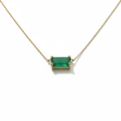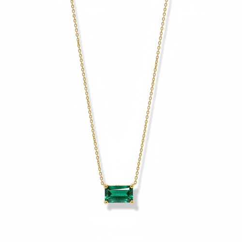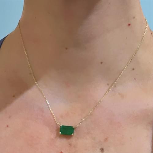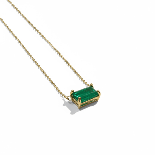 Un dije moderno y minimalista que destaca la belleza natural de una esmeralda rectangular corte baguette/step cut, montada en oro amarillo de 18K con cuatro garras elegantes que permiten que la piedra reciba luz desde todos los ángulos. Su cadena fina realza el look delicado, logrando un estilo atemporal y sofisticado ideal para uso diario o para un brillo sutil y elegante en ocasiones especiales.