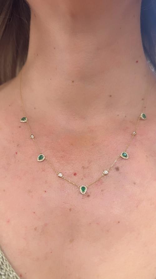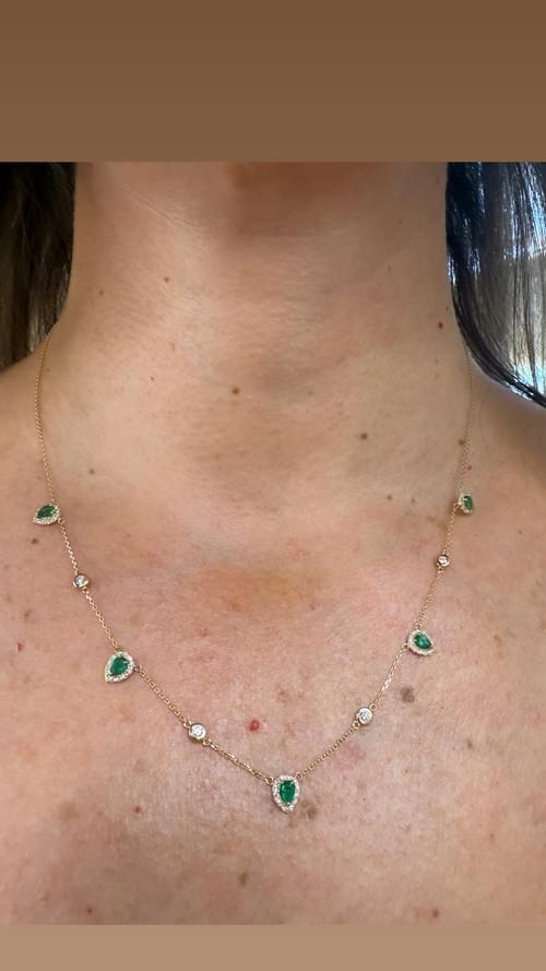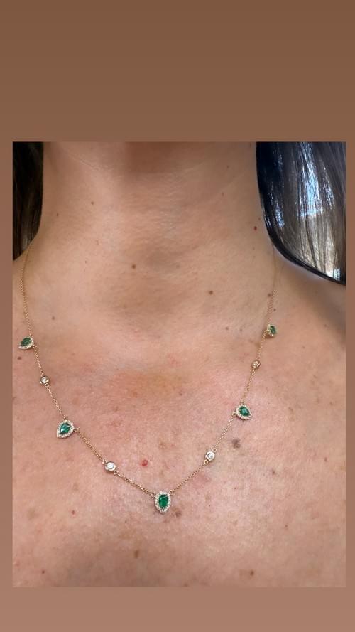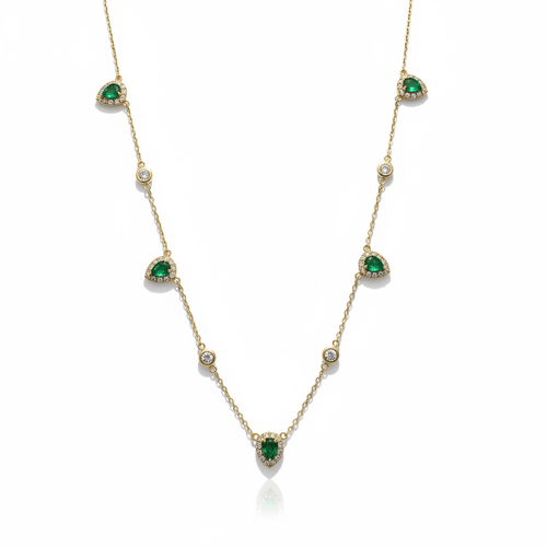 Una gargantilla de oro amarillo de diseño delicado y luminoso, decorada con esmeraldas naturales en corte gota, cada una realzada por un halo de diamantes brillantes que intensifica su color verde profundo.