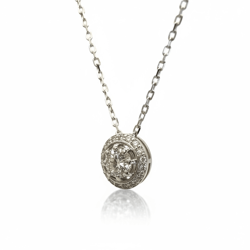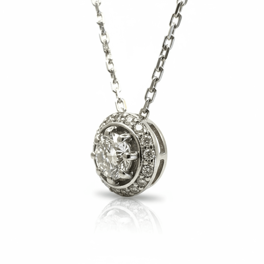 En el centro, un diamante corte brillante redondo resplandece con intensidad, realzado por un halo de diamantes pavé que potencia su brillo desde todos los ángulos.