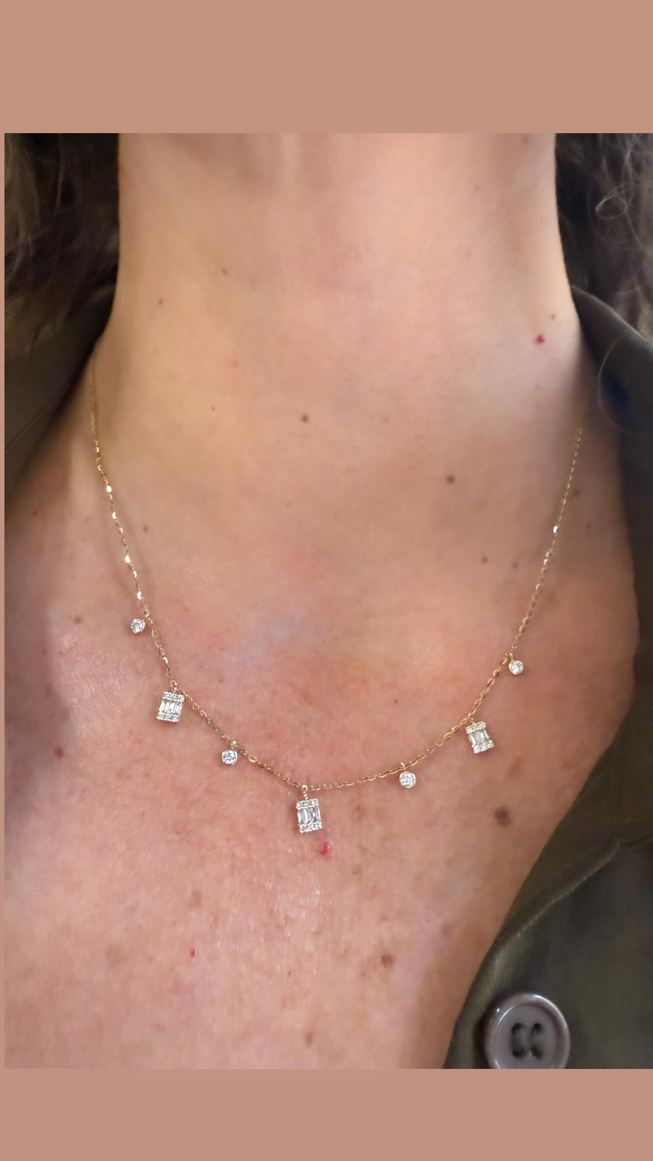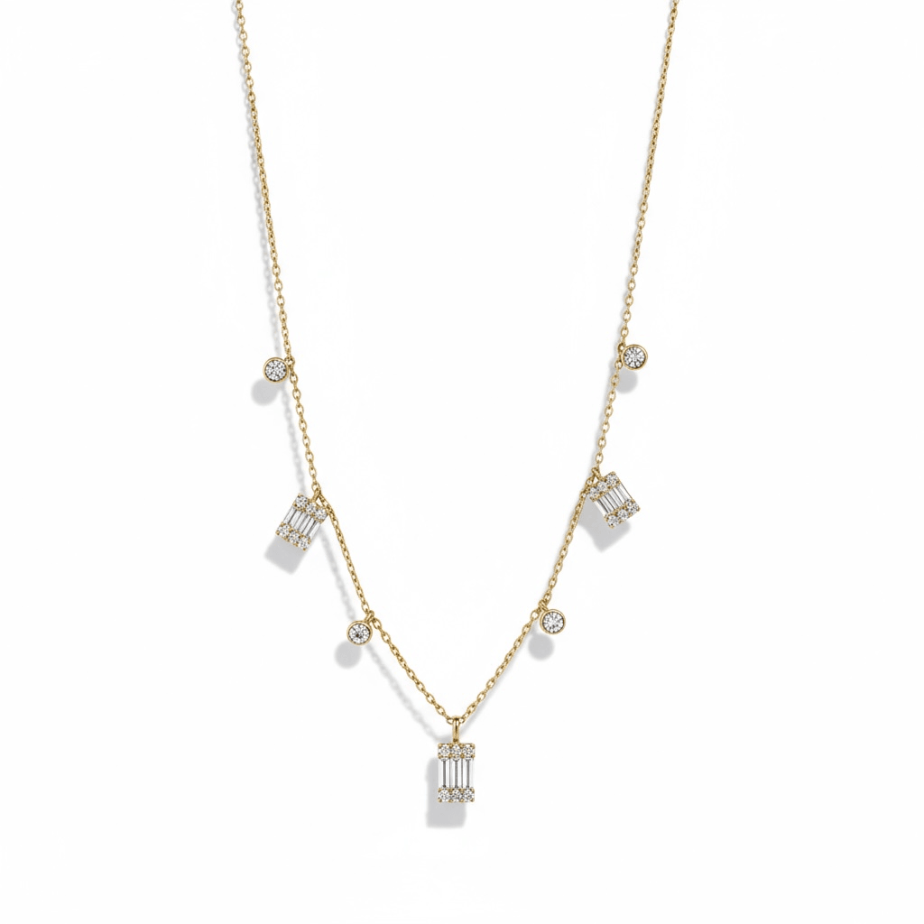 Una delicada gargantilla en oro amarillo de 14K con un diseño moderno y luminoso. Presenta charms colgantes formados por diamantes corte baguette dispuestos verticalmente y enmarcados por diamantes redondos en pavé, alternados con pequeños diamantes bezel engastados directamente en la cadena. El resultado es una pieza que combina la elegancia geométrica del corte baguette con el brillo clásico del brillante redondo, creando un movimiento sutil y sofisticado sobre el cuello.