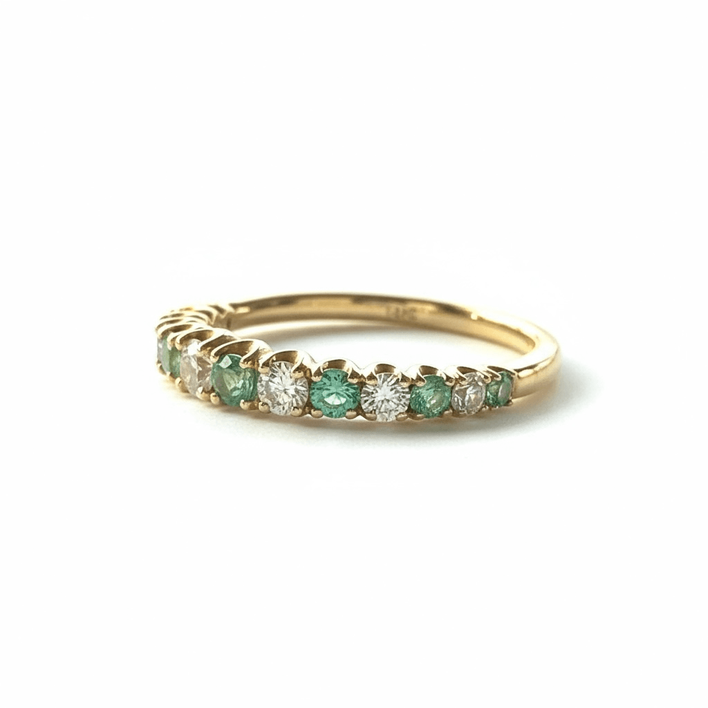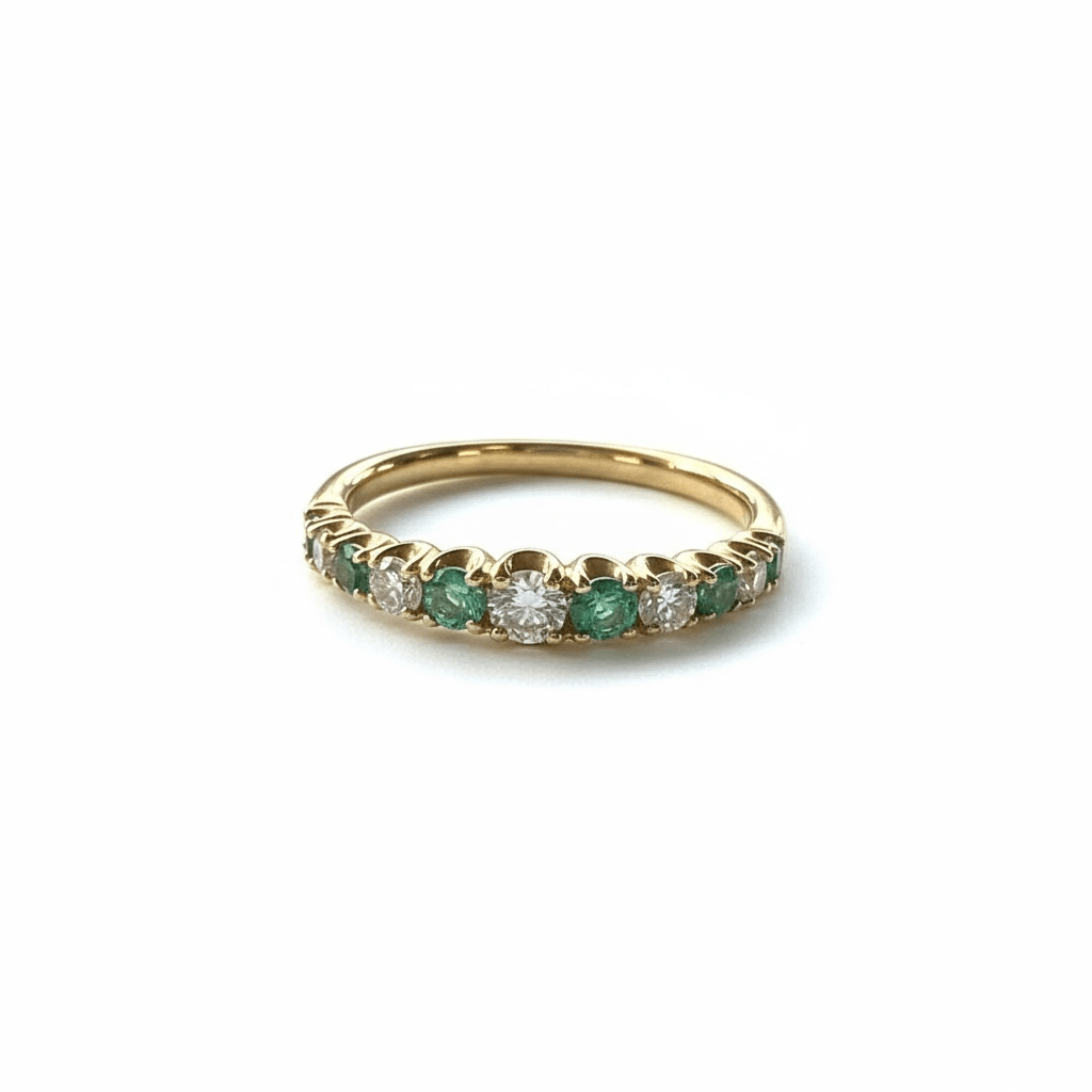 Elegante churumbela en oro amarillo de 14K, engastado con una hilera alternada de esmeraldas y diamantes en corte brillante redondo. Su diseño atemporal simboliza equilibrio y armonía, perfecto para lucir en cualquier ocasión, como una joya con un significado especial.
