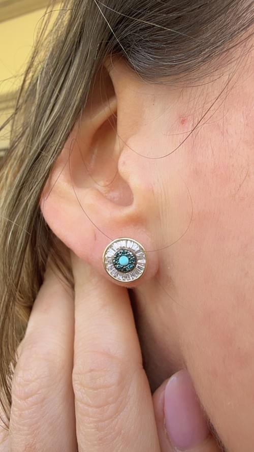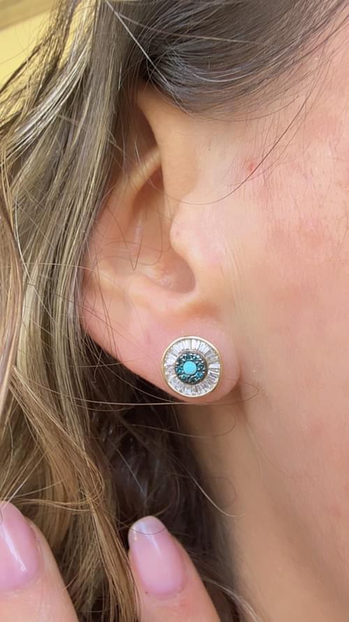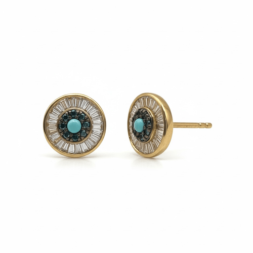 Aretes estilo botón elaborados en oro amarillo, con un diseño tipo “ojo protector” reinterpretado en clave de alta joyería.