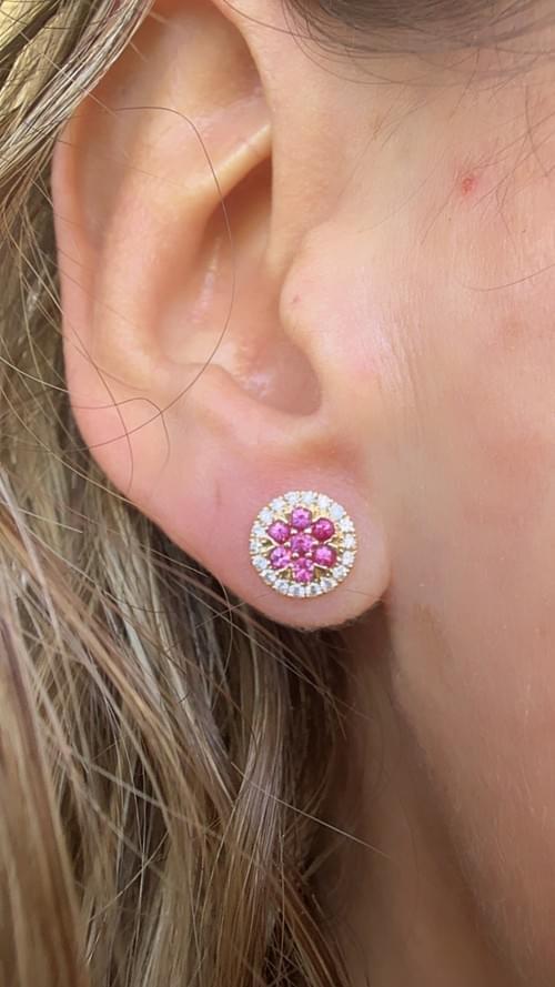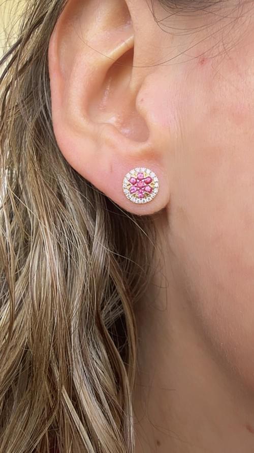 Aretes tipo stud en oro amarillo de alta gama, con un diseño floral central formado por zafiros rosados cuidadosamente engastados en forma de pétalos. Cada flor está rodeada por un halo perfecto de diamantes naturales en corte brillante, creando un efecto luminoso y elegante que realza el color vibrante del centro.