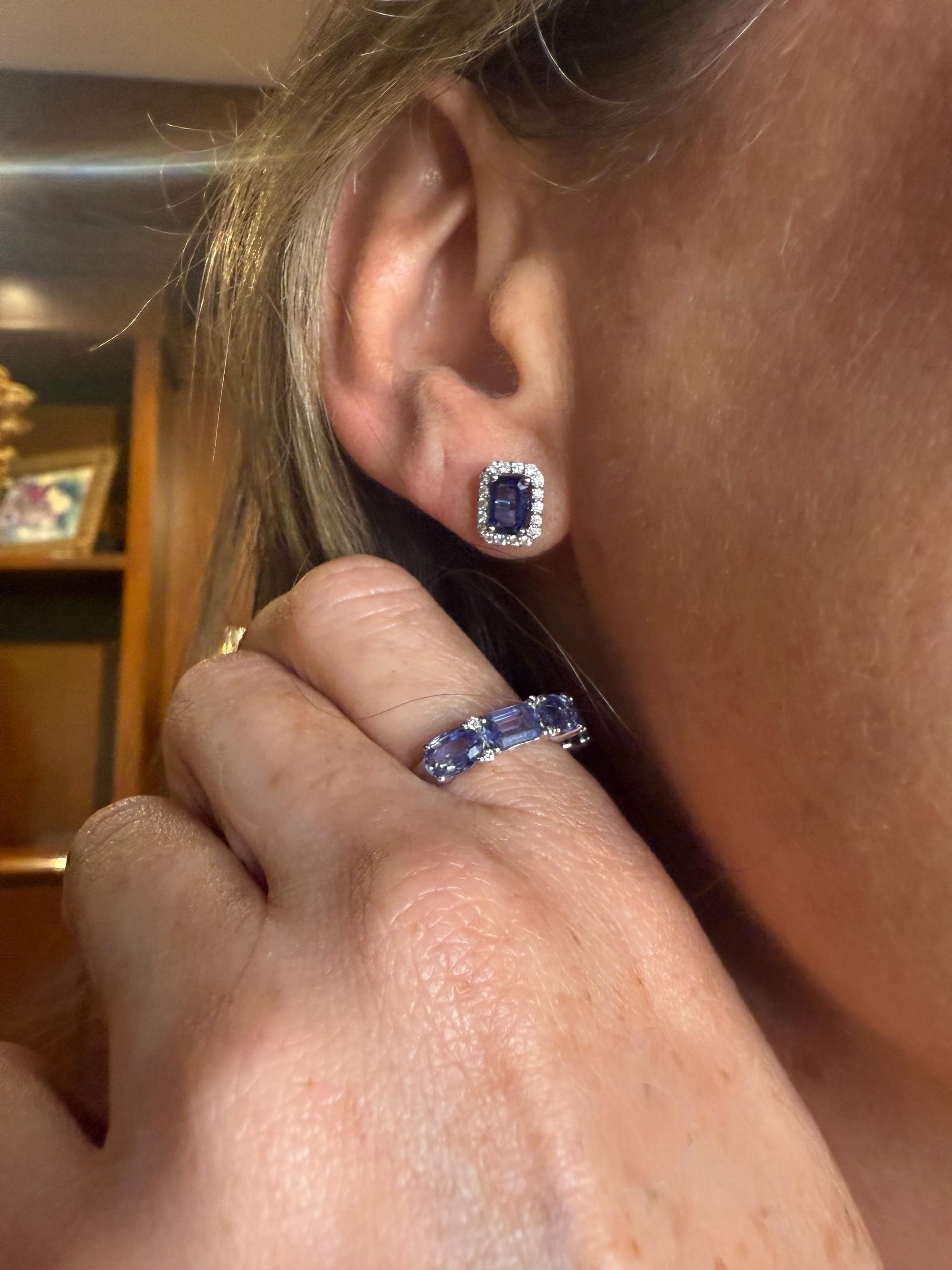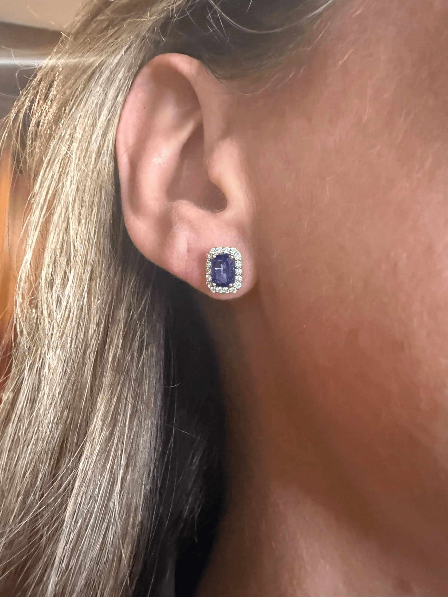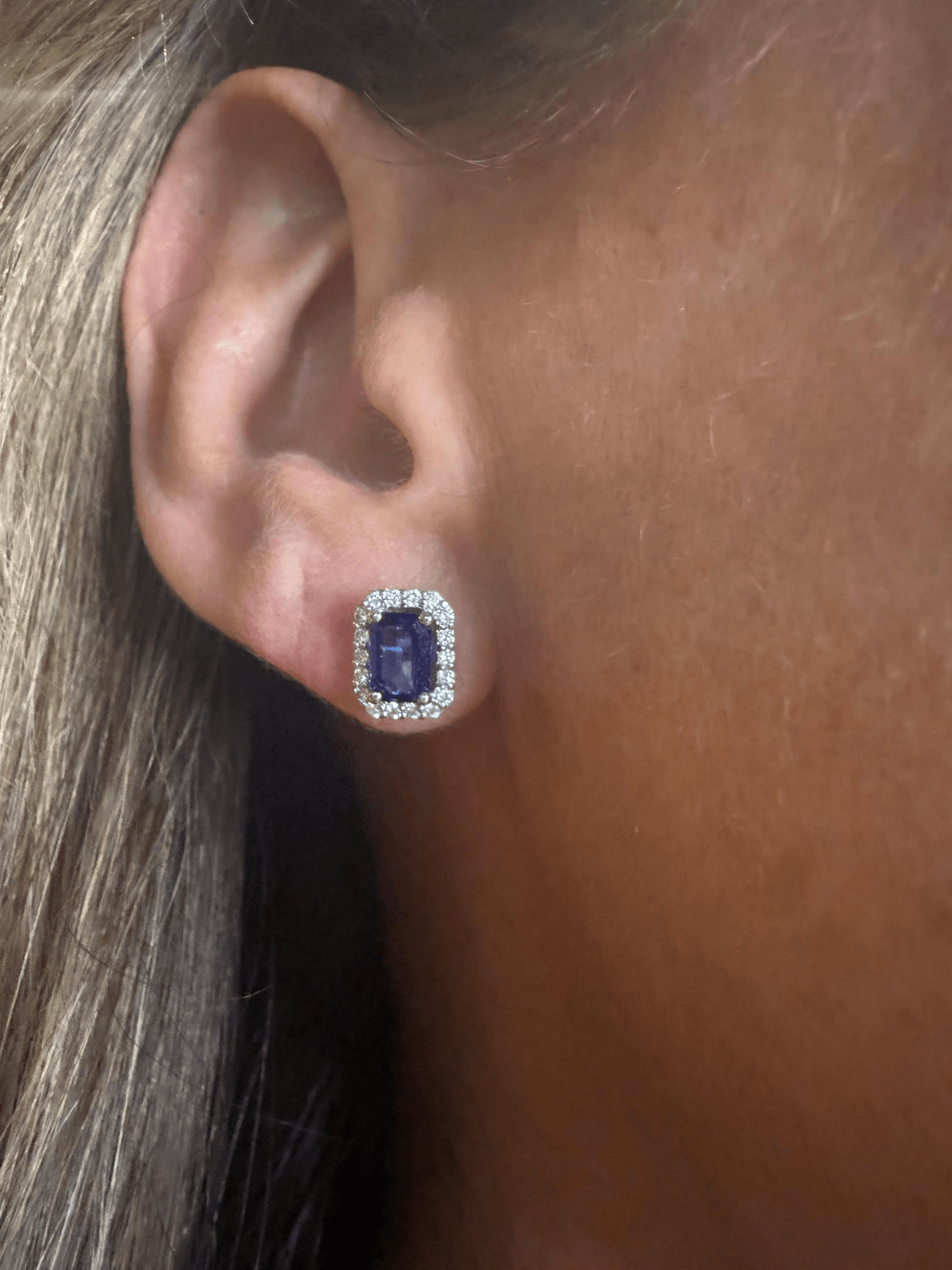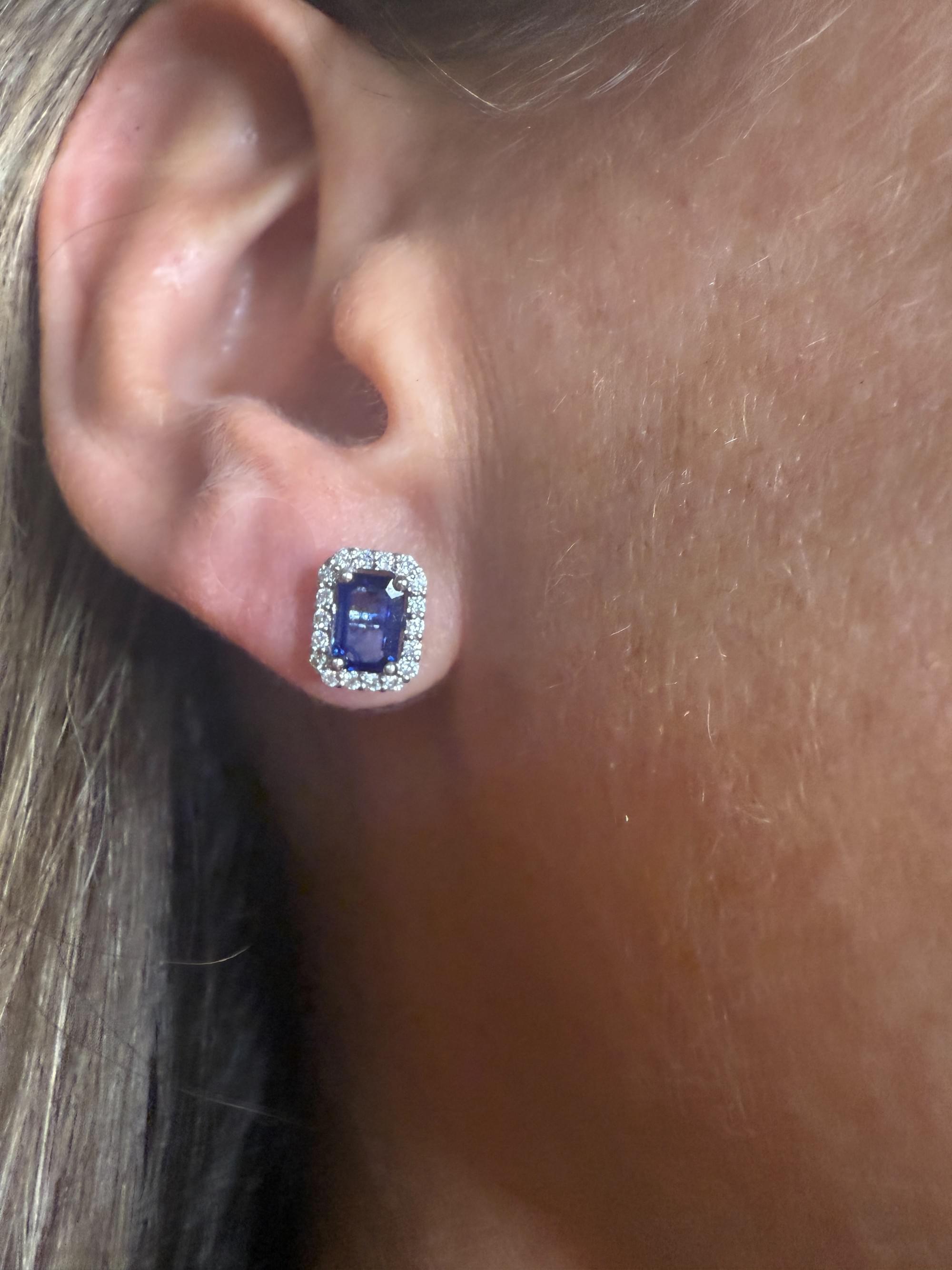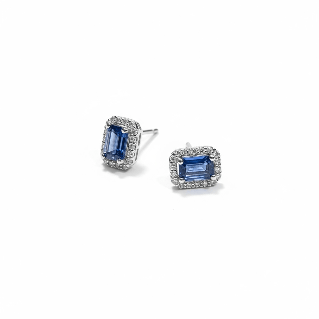 Elegantes aretes tipo stud con zafiros azules en corte esmeralda, enmarcados por un delicado halo de diamantes redondos que realza su brillo y profundidad. Su diseño clásico con montura en oro blanco combina la intensidad del azul profundo con el resplandor del pavé de diamantes, logrando un equilibrio perfecto entre sofisticación y sutileza.