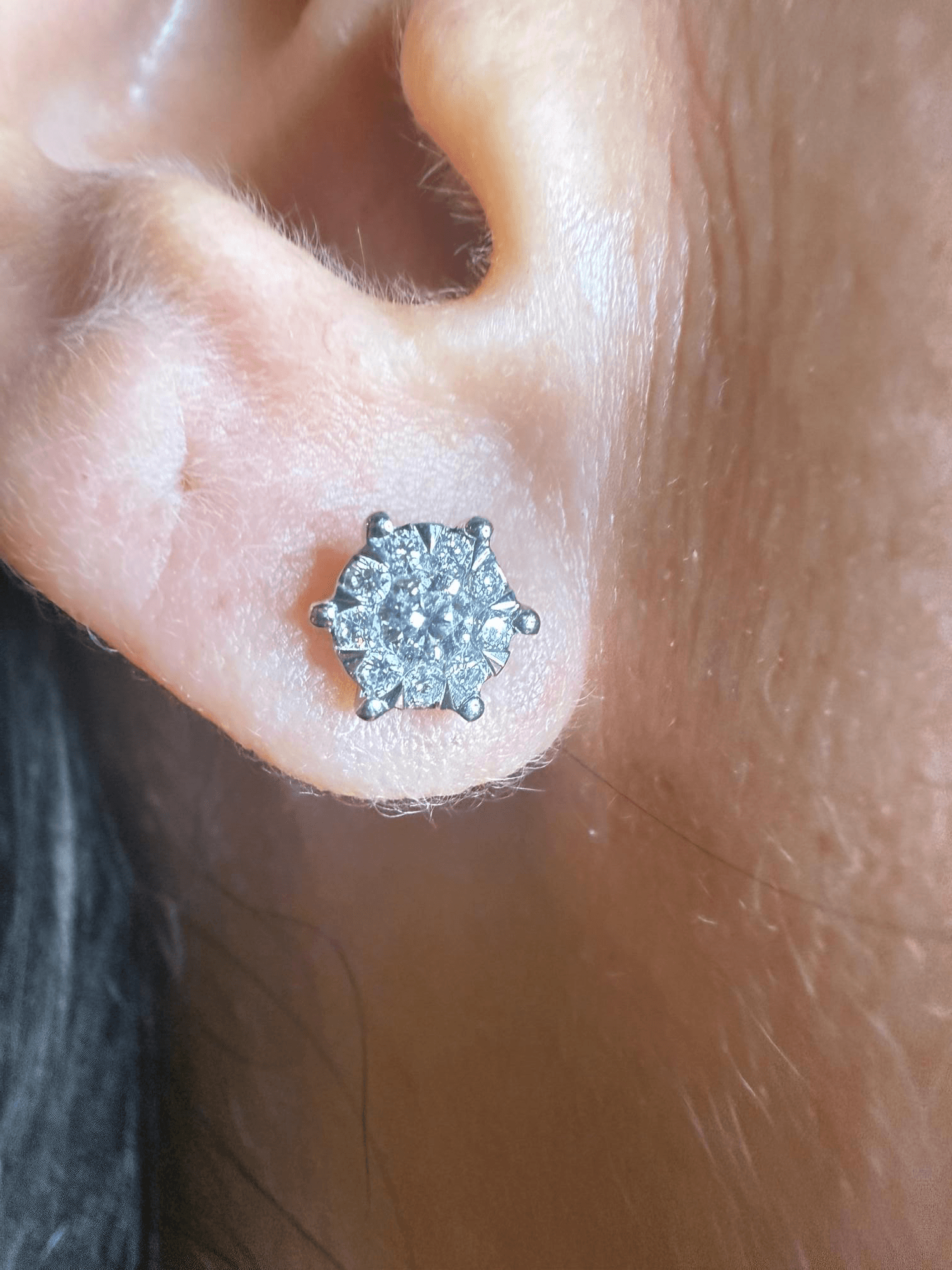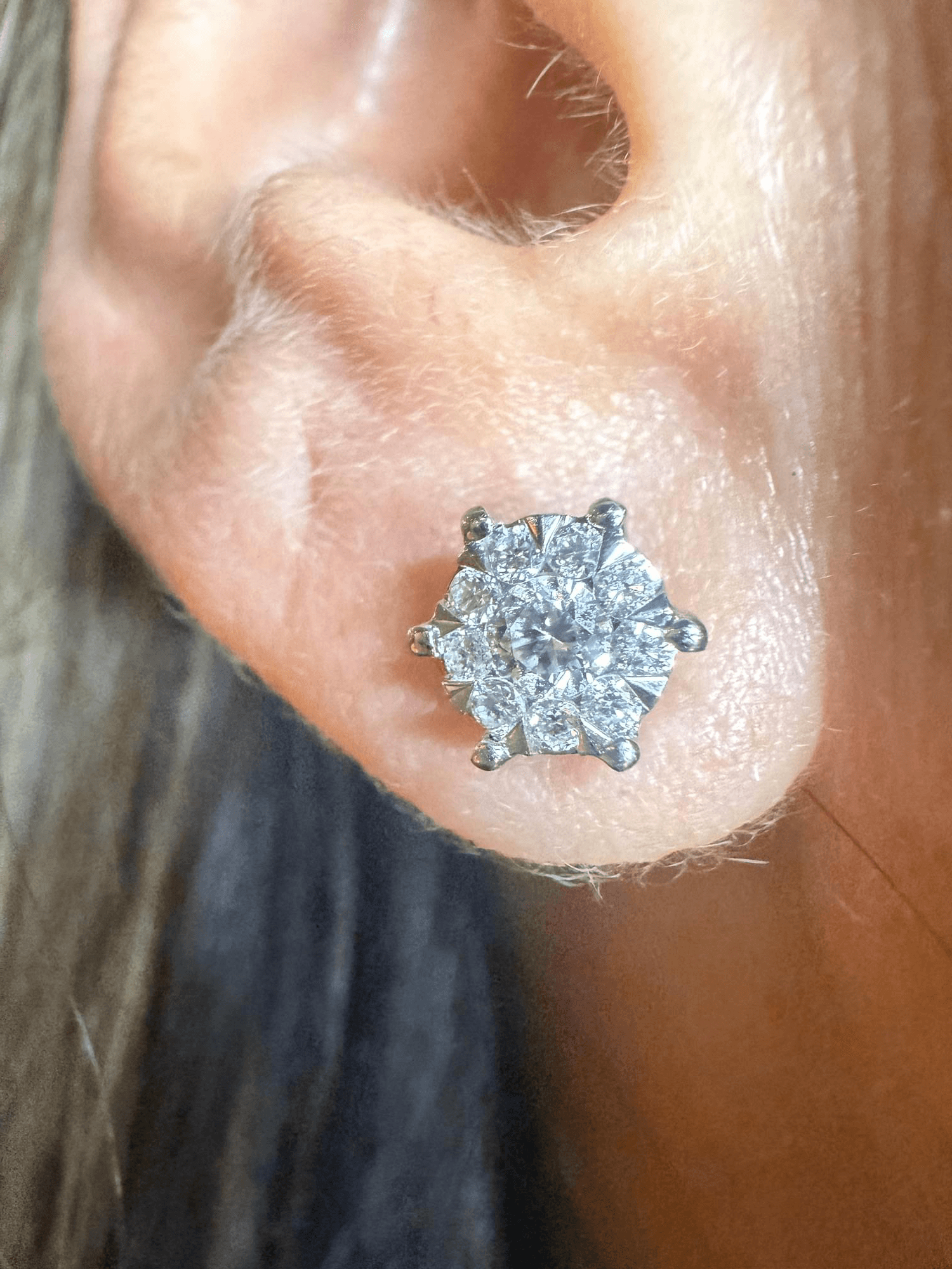 Estos elegantes aretes tipo botón están formados por un diamante central de corte brillante redondo rodeado por un delicado halo floral de diamantes más pequeños, que realzan su luminosidad y crean un efecto óptico de una flor resplandeciente. Montados en oro amarillo de 14K con garras finas que permiten el máximo brillo, combinan la pureza del oro blanco en el frente con el cálido toque del oro amarillo en el cierre, logrando un contraste clásico y sofisticado.