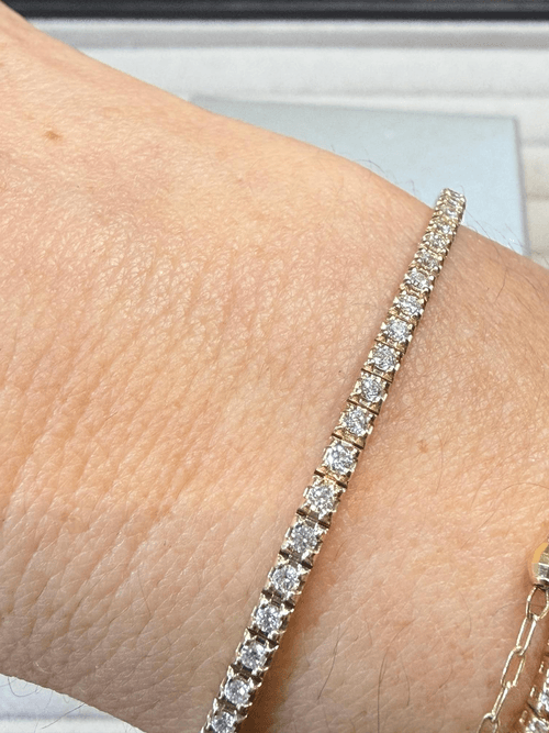 Brazalete tipo tennis elaborado en oro amarillo, compuesto por una línea continua de diamantes naturales corte redondo brillante, cuidadosamente alineados en engaste de cuatro garras que permite máxima entrada de luz y un destello uniforme en cada movimiento.