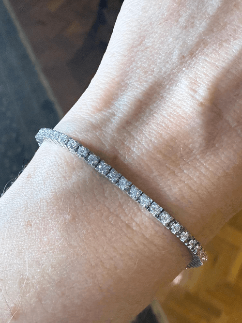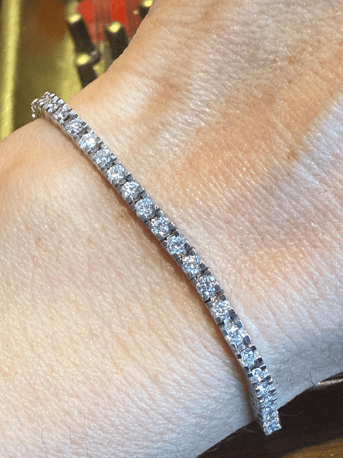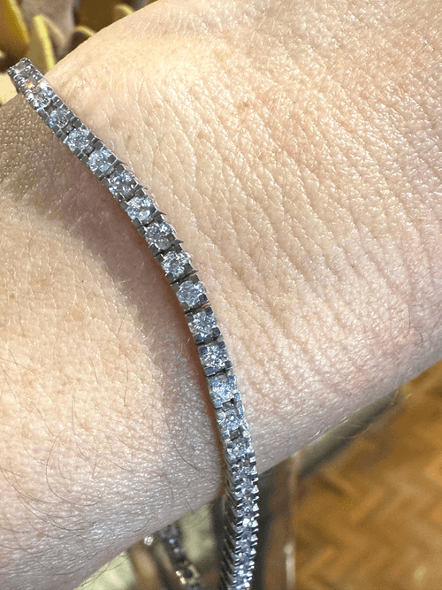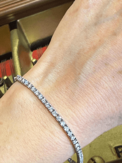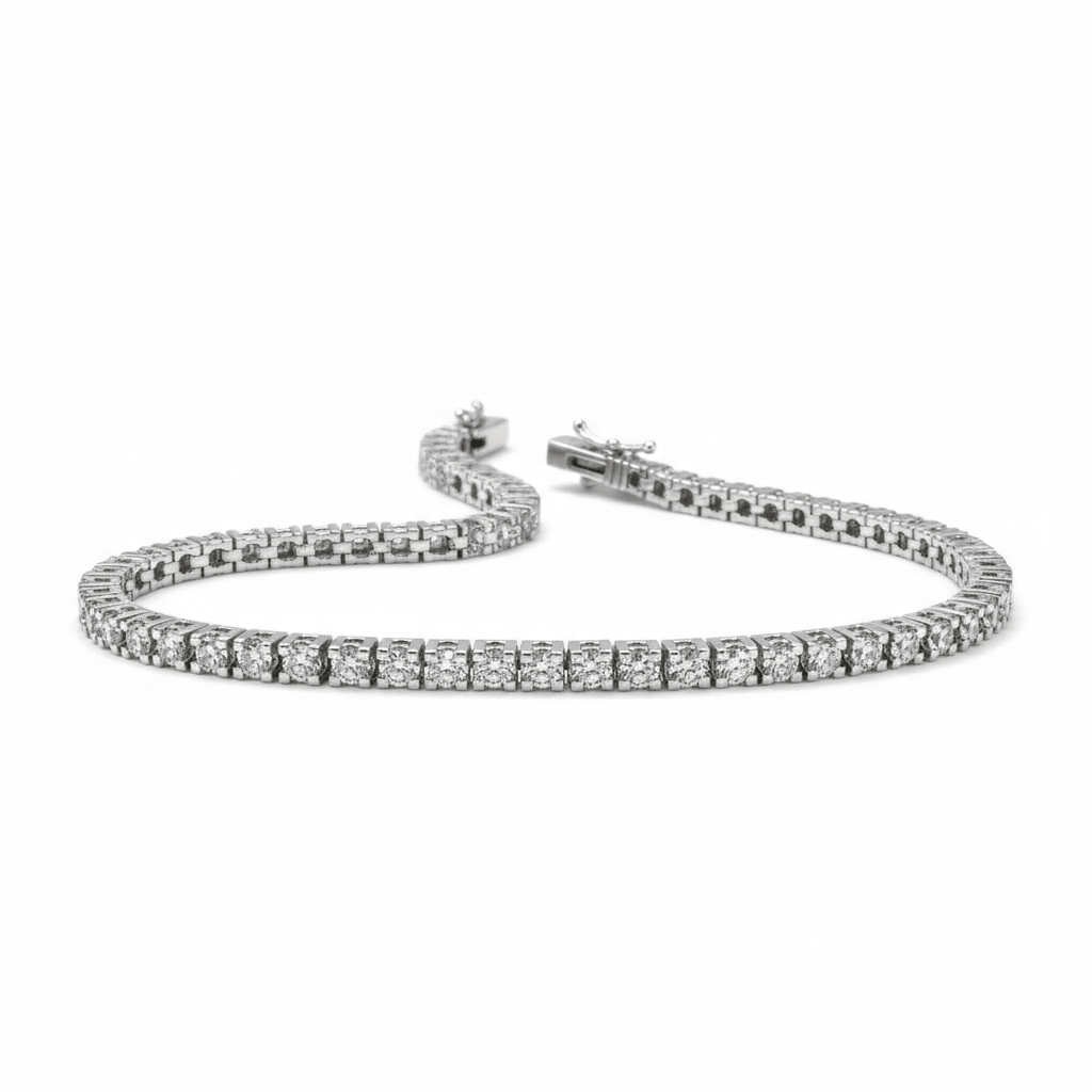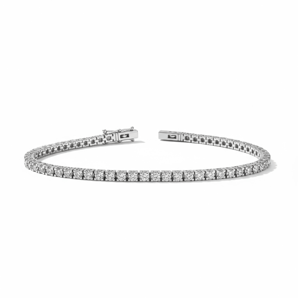 Un brazalete tipo tennis de elegancia atemporal, elaborado en oro blanco y engastado con una sucesión perfecta de diamantes corte brillante redondo. Cada piedra está cuidadosamente montada en un marco de cuatro garras que permite el máximo destello y flexibilidad en el movimiento. Su diseño clásico, equilibrado y luminoso lo convierte en una pieza esencial tanto para ocasiones especiales como para el uso diario de lujo.