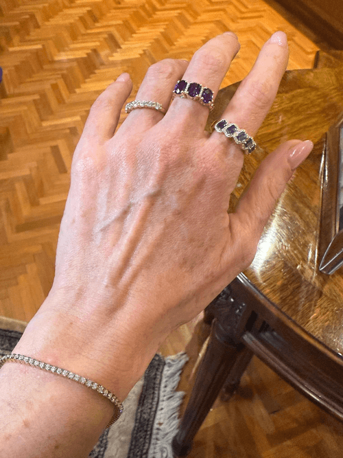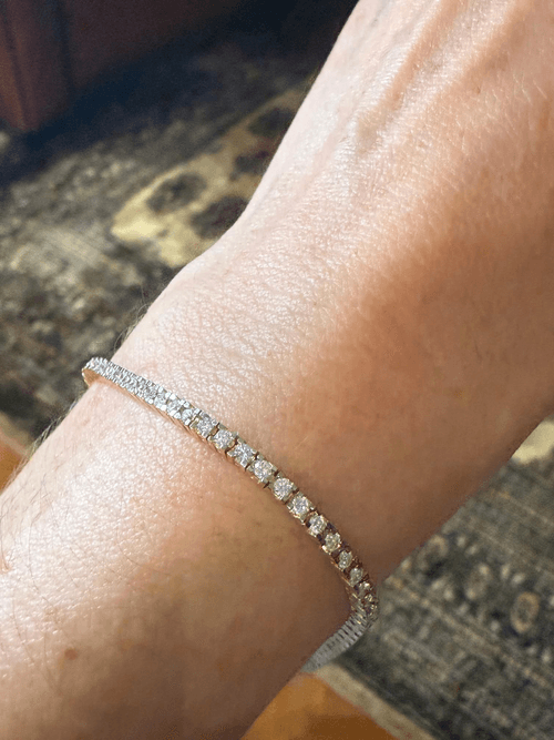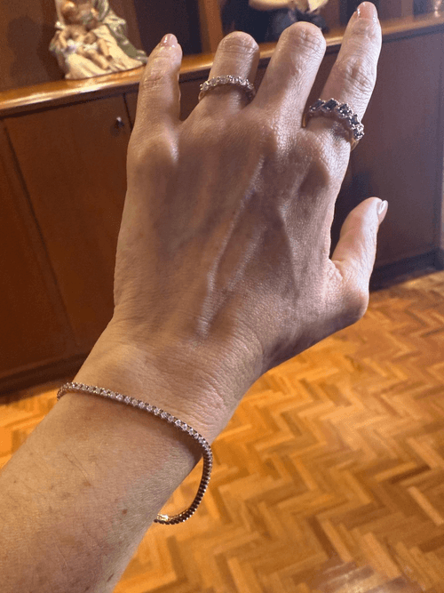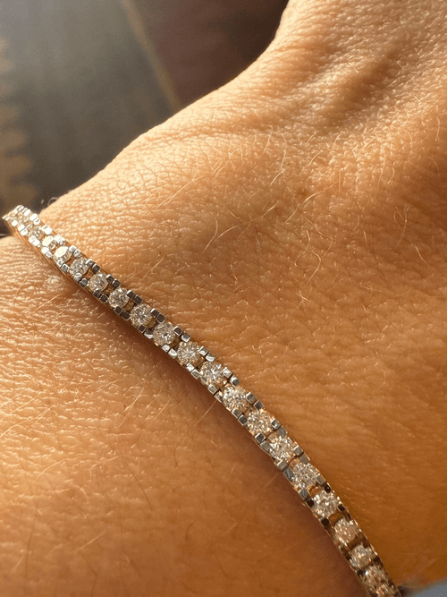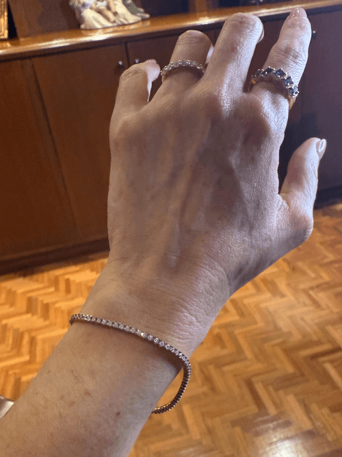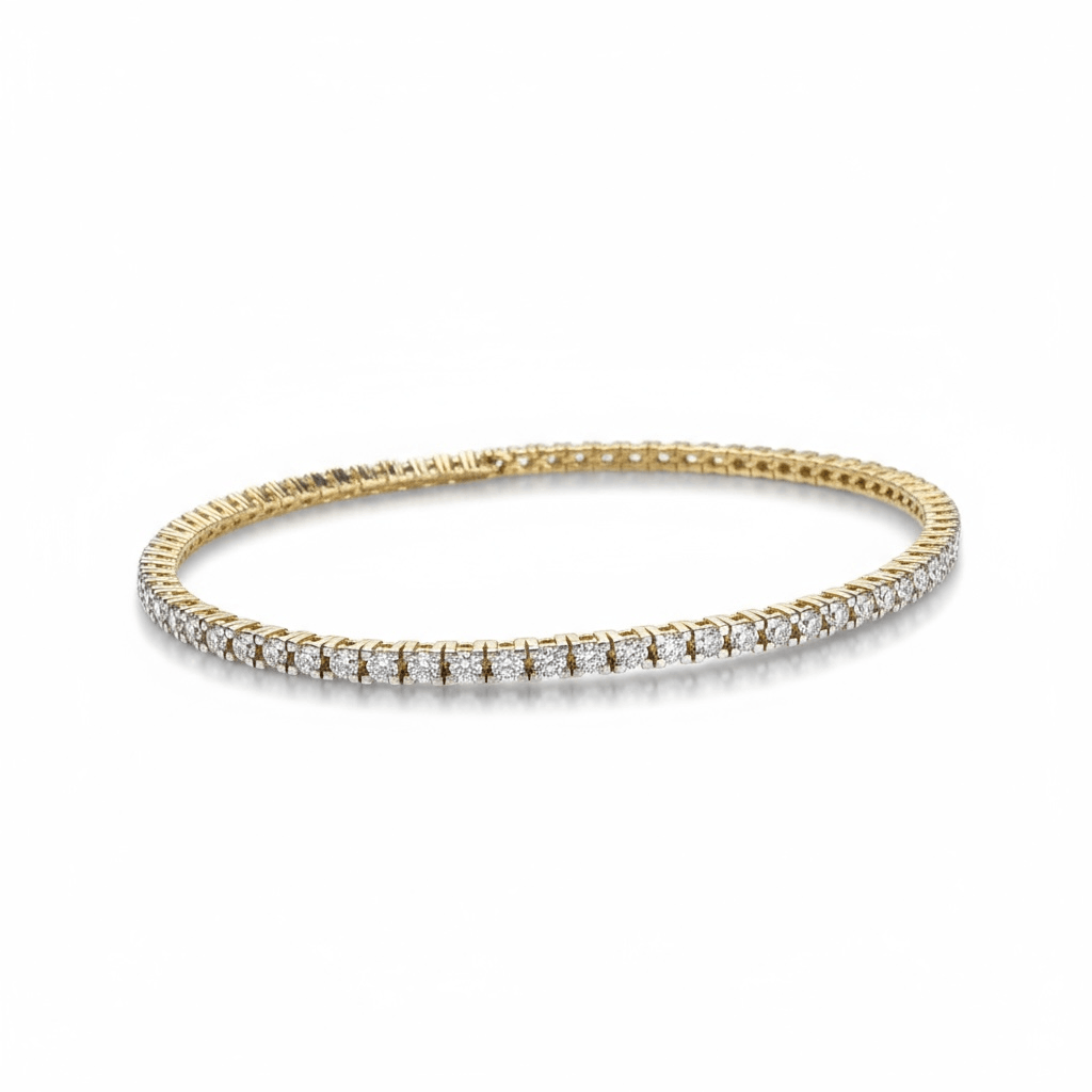 Un brazalete tipo tennis elaborado en oro amarillo de 14K, engastado con una hilera continua de diamantes redondos en corte brillante, que ofrecen un resplandor clásico y sofisticado. Su diseño flexible y uniforme realza la luz en cada movimiento, combinando la calidez del oro con el brillo puro del diamante. Perfecto para llevar solo o en combinación con otros brazaletes finos.