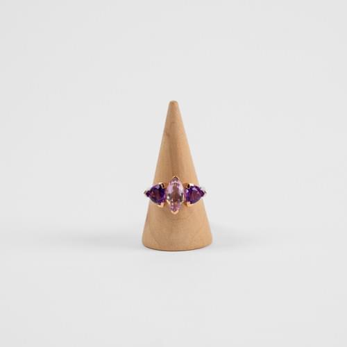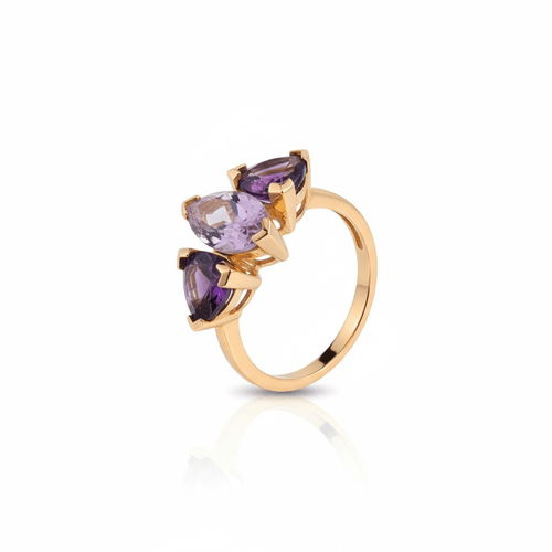Anillo elaborado en oro amarillo con un diseño de tres piedras que crea una composición equilibrada y sofisticada. Al centro, una amatista rosa destaca por su brillo suave y femenino, flanqueada por dos amatistas moradas de tono profundo que aportan contraste y elegancia.